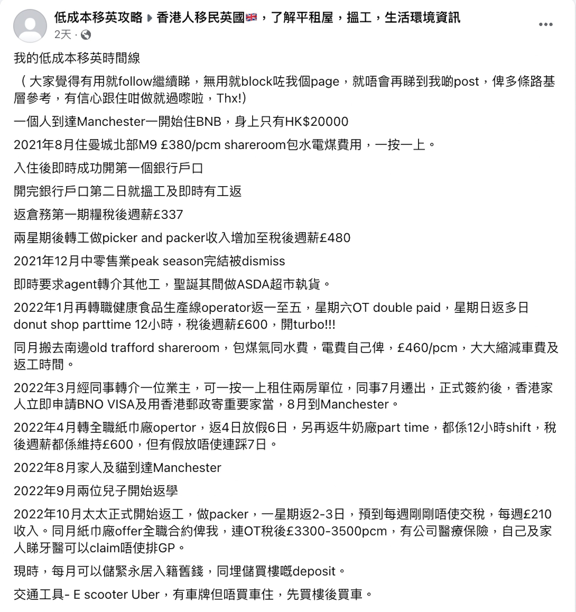 近月有移英港男在FB開設「低成本移英攻略專頁」,分享自己低成本移英時間線。根據版主的分享,他中五6科合格,英文 syllabus B攞E,2021年移英時,他一人住曼徹斯特BNB,身上只有二萬元港元身家,「當日只有兩年半簽證、單程機票、$20000港幣現在開始了移民的旅程」。