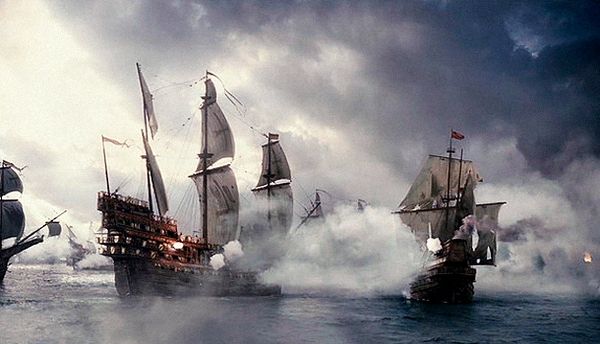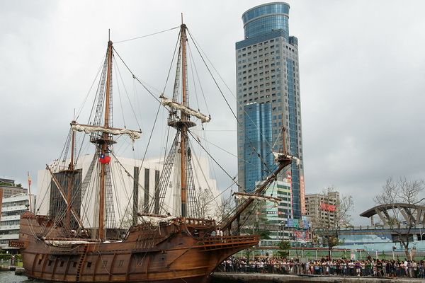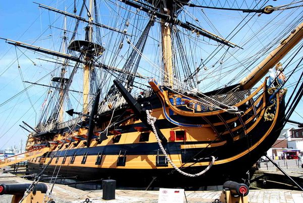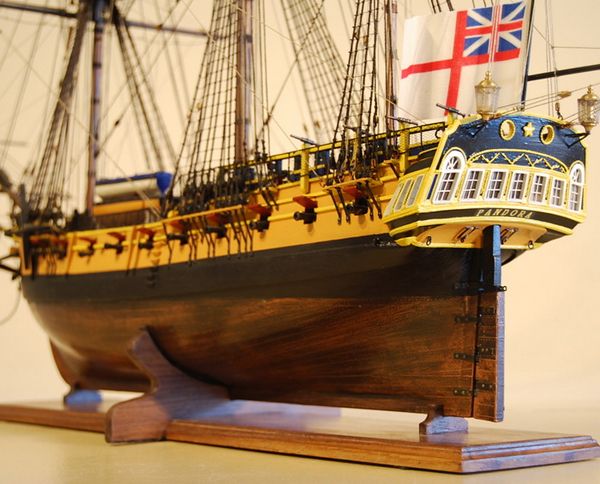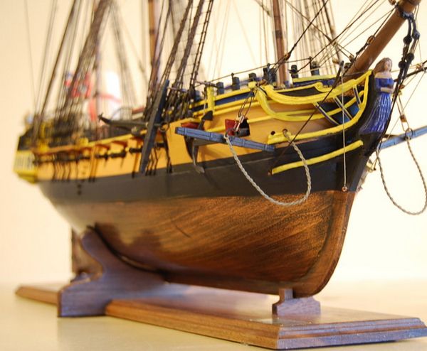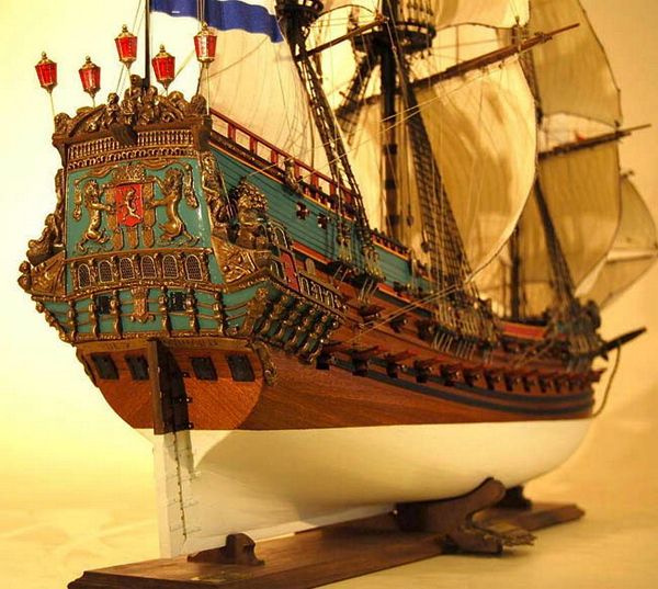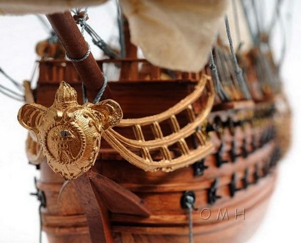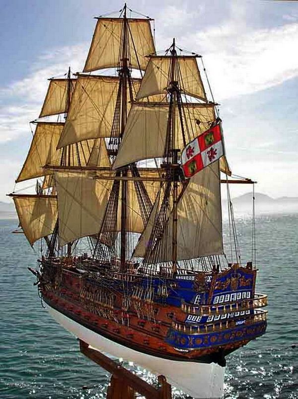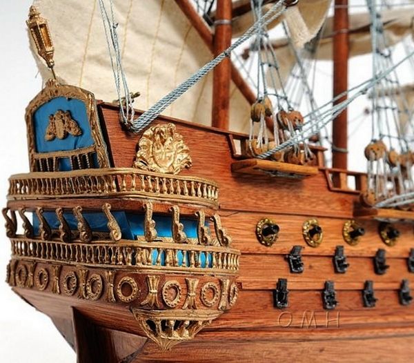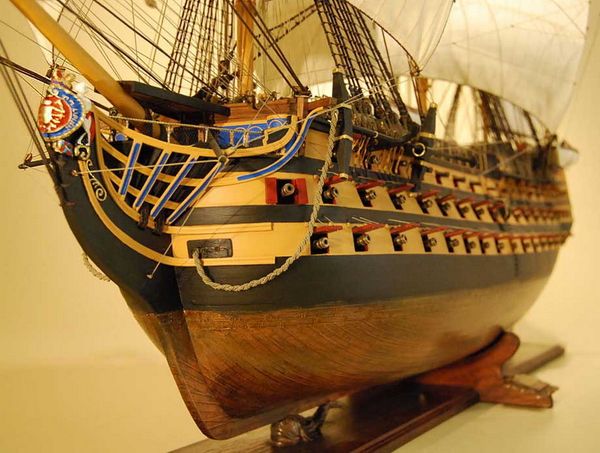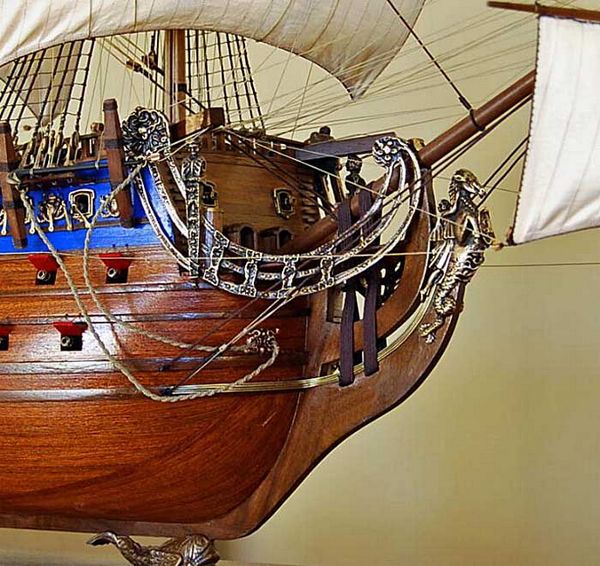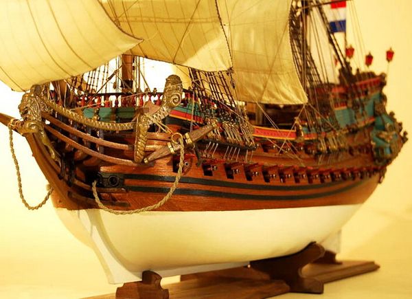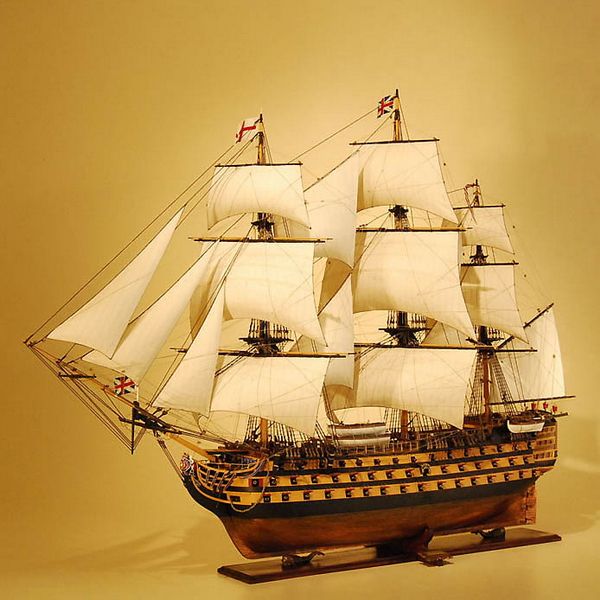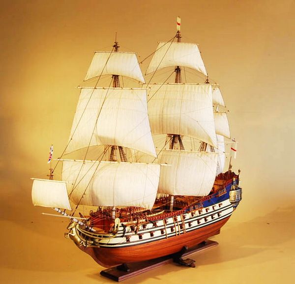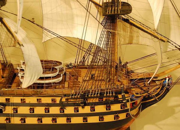 3) 部分帆展開全帆裝模型(fully-rigged models with partially set sails),這種方法也很流行。通常採取中帆和上帆展開,而下帆卷在桁上,或者把帆腳收上去,讓甲板和下部索具亮出來。一般來說,在這種模型上,支索帆也是不裝的。