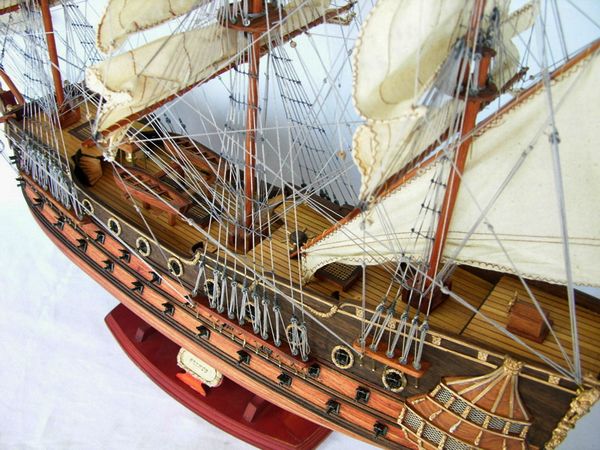 4) 帆展開全帆裝模型(fully-rigged models with sails set)。錯綜複雜的索具的全部功能,理所當然地只有在所有的帆(包括支索帆,甚至於翼帆)全部都展開時,才能顯現出來。而且,很顯然,只有帶有全套展開帆的船模才能給人以至高的視覺享受。為了避免展開的帆把全部的索具遮蔽,可以將全部的橫桁統一地轉動某個角度,這樣,至少在一個側面方向,可以展現部分索具。
