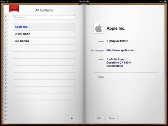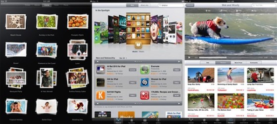 應用程式新設計。 Apple 自己的核心應用也都更新到iPad 版本。比如Safari 專門有一排是放書籤的,App Store 有了CoverFlow 封面式的版面,照片應用可以把照片都堆砌呈現,用手指往外擴張則能預覽“這堆”照片,簡化的音樂應用界面添加了像iTunes 的專輯封面,“設置”也以“左右對照”的呈現方式改變。本地應用通過一些界面的小改變,適應了iPad 1024x768 的螢幕解像度。