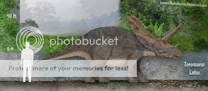 Torosaurus is among the largest ceratopsians.It possessed one of the largest skulls of any known land animal.The frilled skull reached over 2.77 metres (9.1 ft) in length.Torosaurus was about 21-25 ft in length and weighed 4 - 6 tonnes.