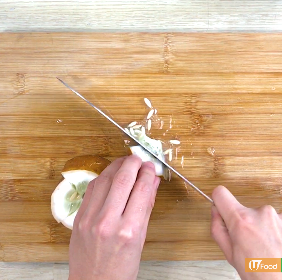 老黃瓜洗淨後切塊,去核備用。