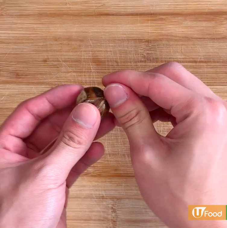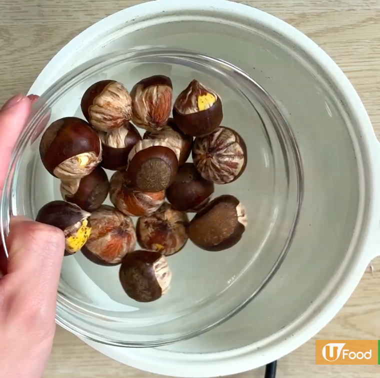 材料洗淨,水滾後加入栗子焗10分鐘,方便去殼去皮。