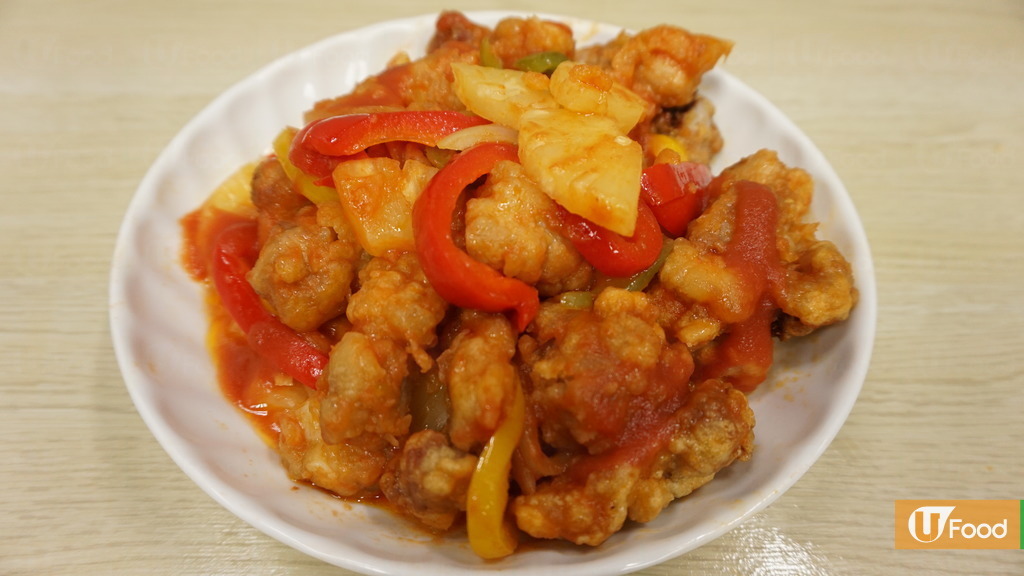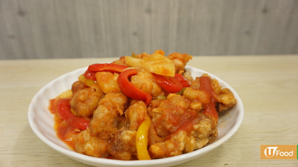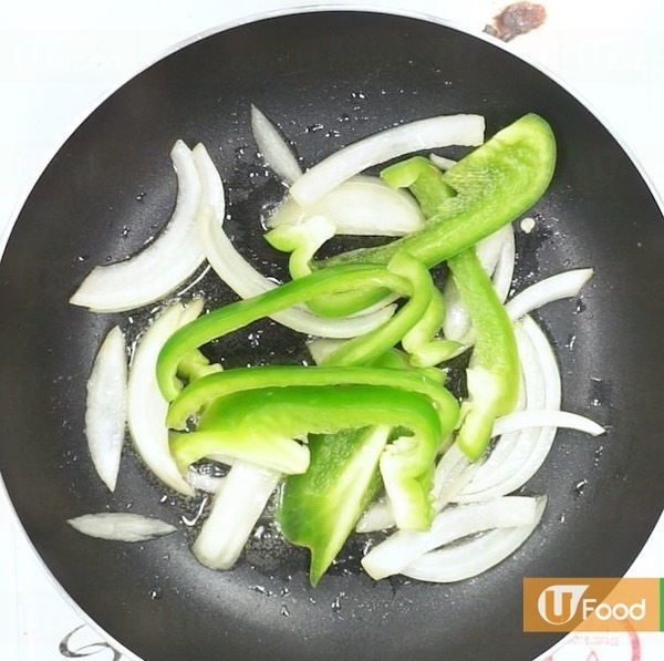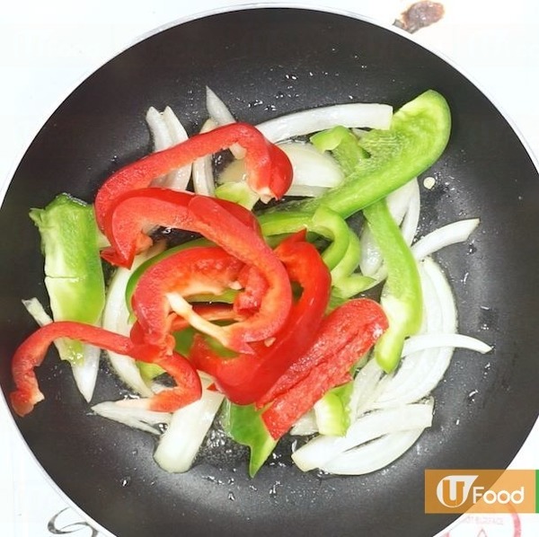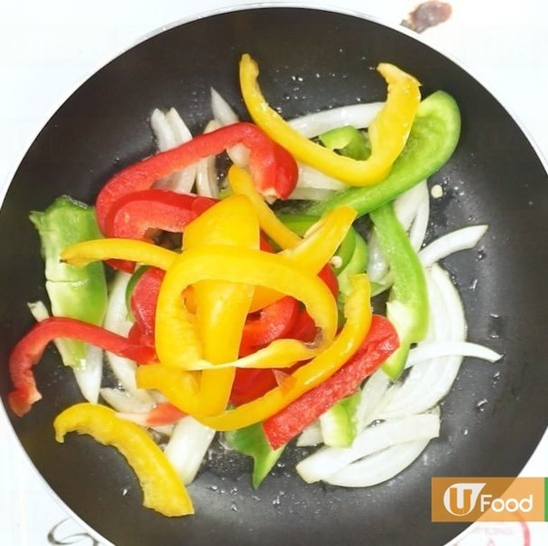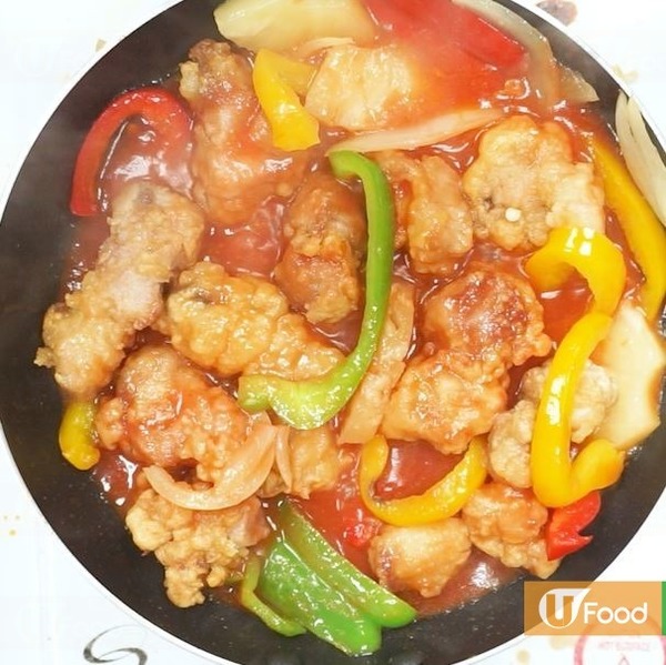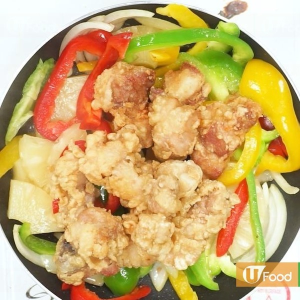 6.放入洋蔥、三色椒和菠蘿片炒勻,再放入已炸好的排骨,最後倒入甜酸汁炒勻。