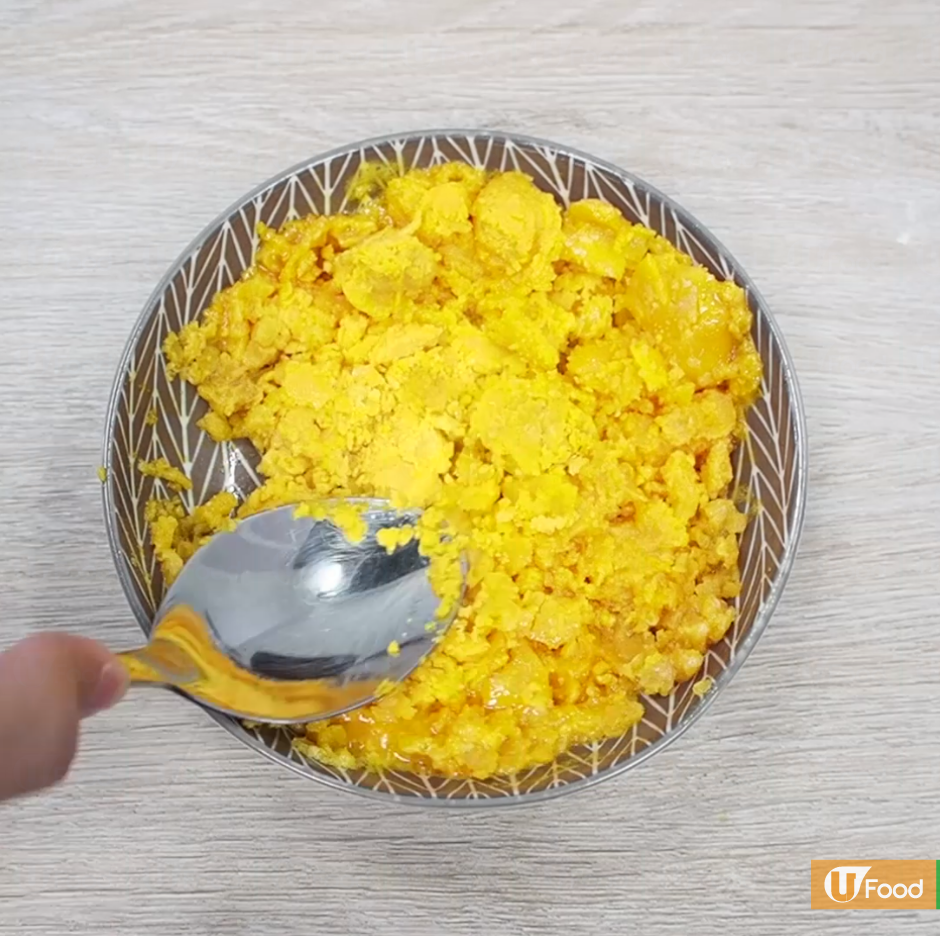 4. 咸蛋黃可蒸約5分鐘或放到微波爐加熱1分鐘,然後壓成蓉
