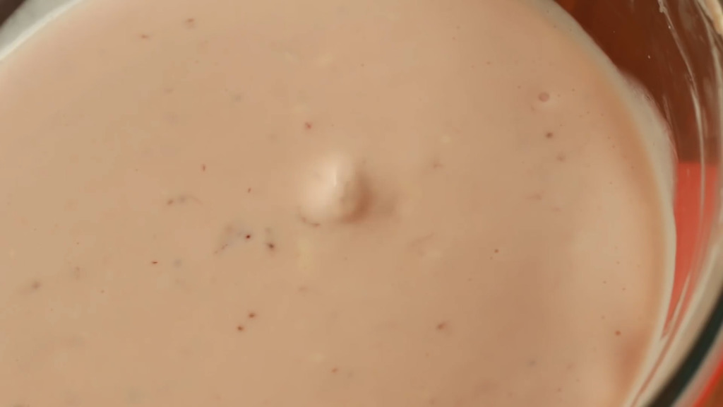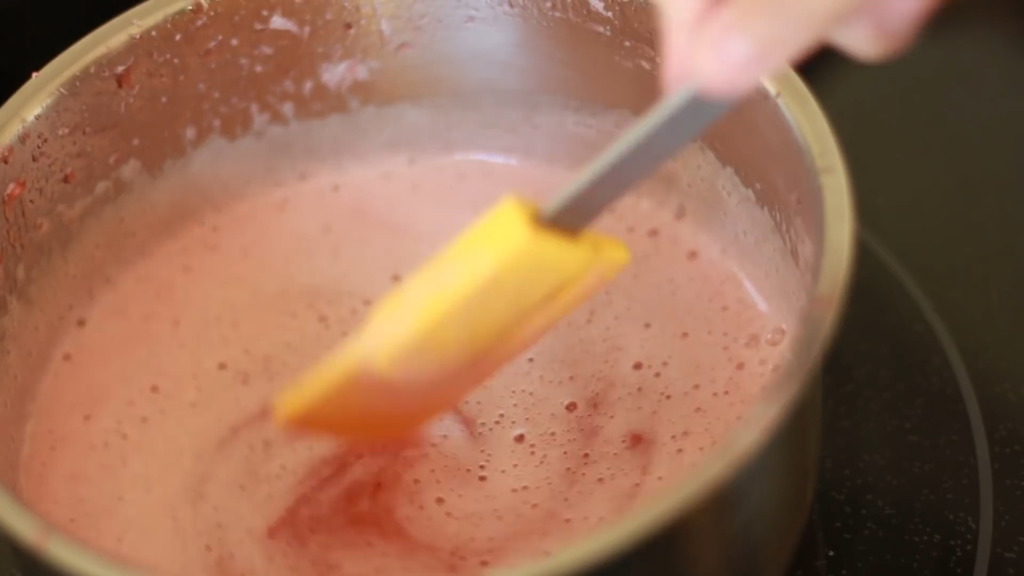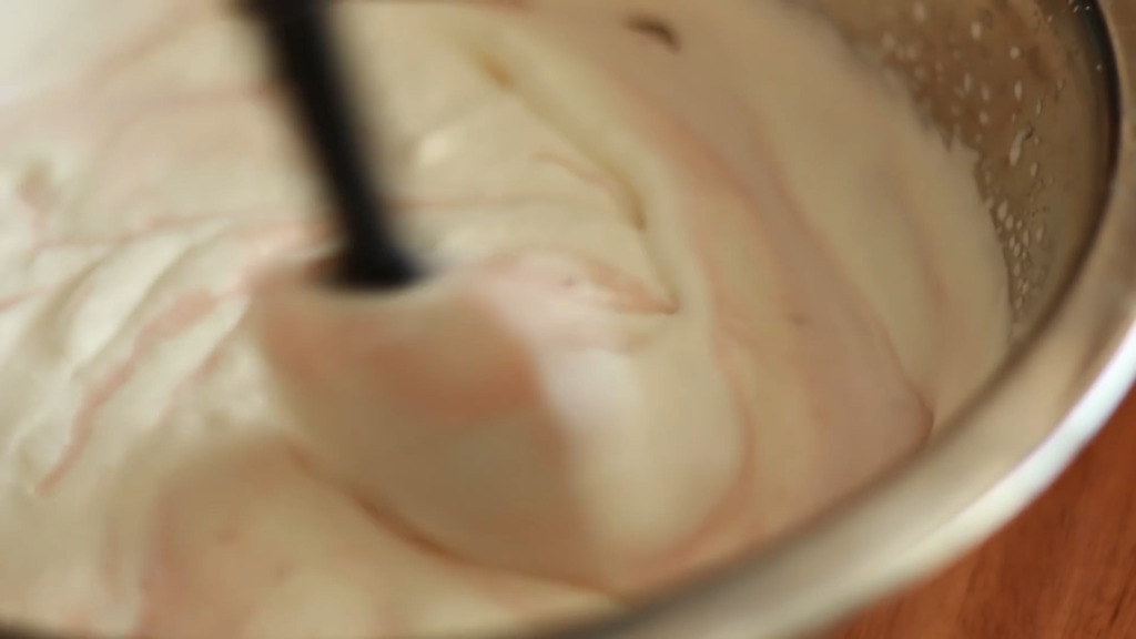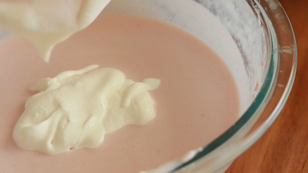 9. 先把少部分淡忌廉加入士多啤梨芝士溶液中攪拌,再倒回淡忌廉內,用刮刀輕手拌勻