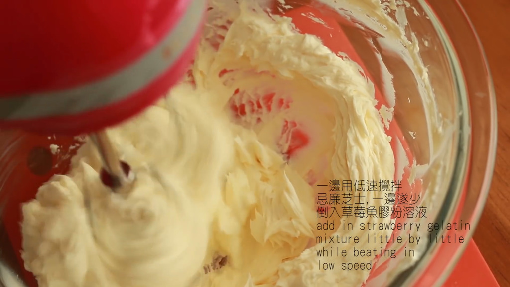 7. 一邊用低速攪拌忌廉芝士,一邊逐少倒入士多啤梨魚膠粉溶液,攪拌至滑身
