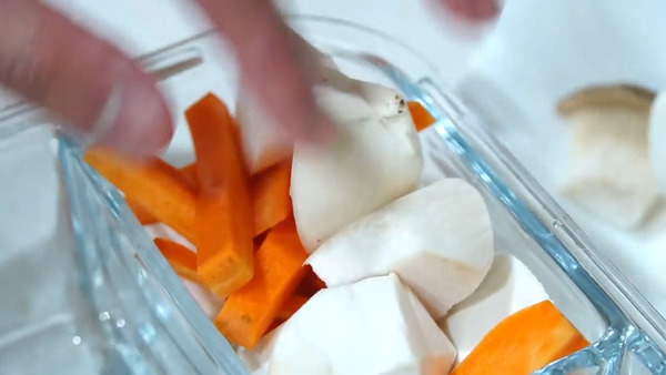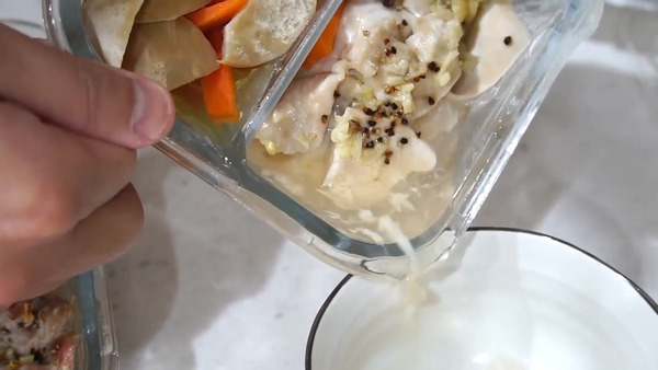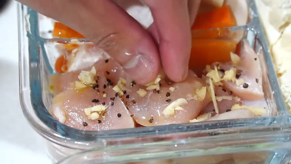 3. 雞胸肉加入鹽、黑胡椒和蒜蓉調味,杏鮑菇加入少許油