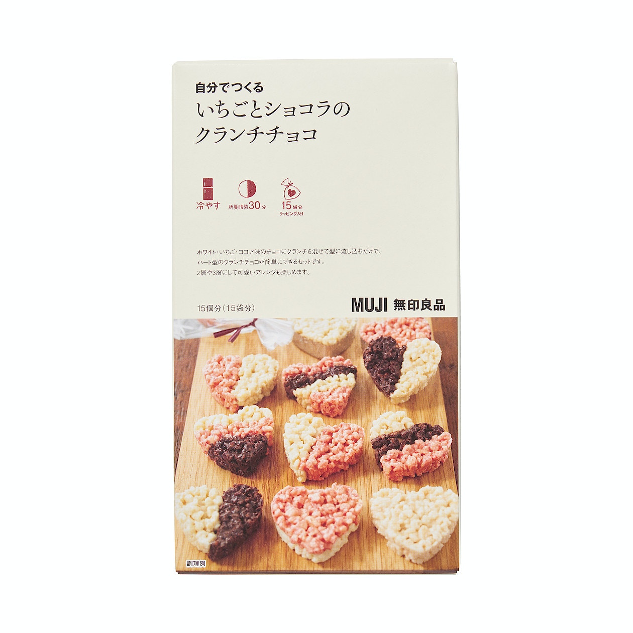 冷藏時間即只需10分鐘,整個製作過程約為30分鐘,一盒材料可製作15件,適合送給朋友或情人。(無印良品)