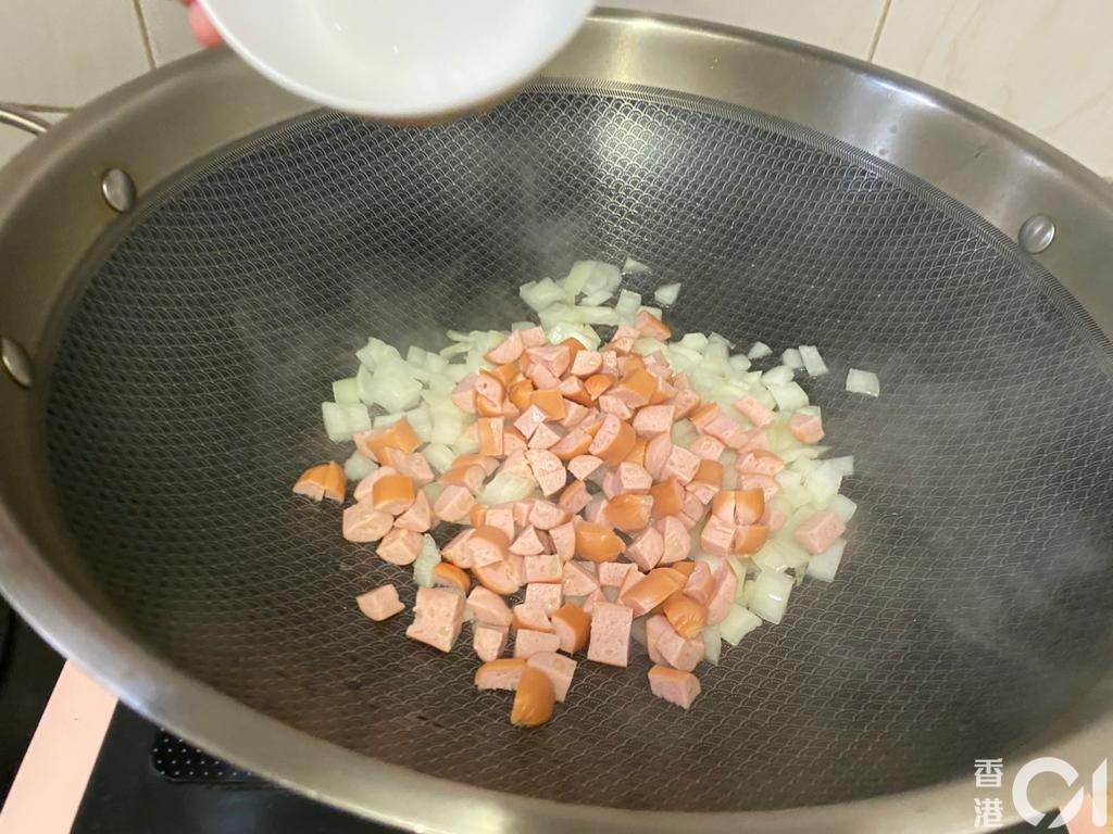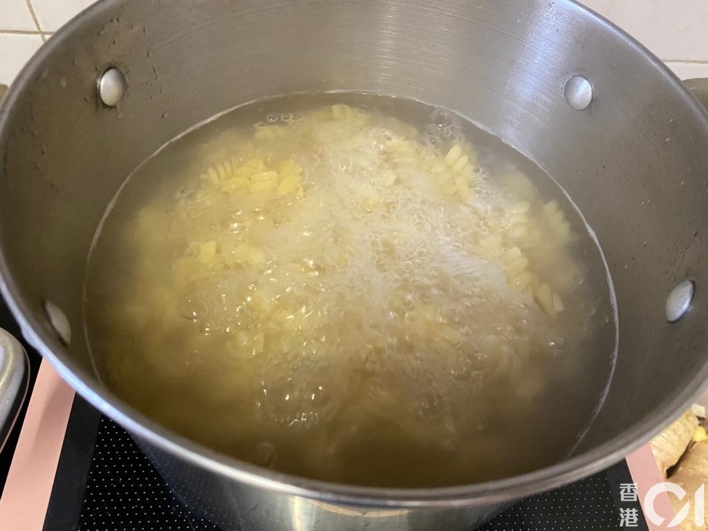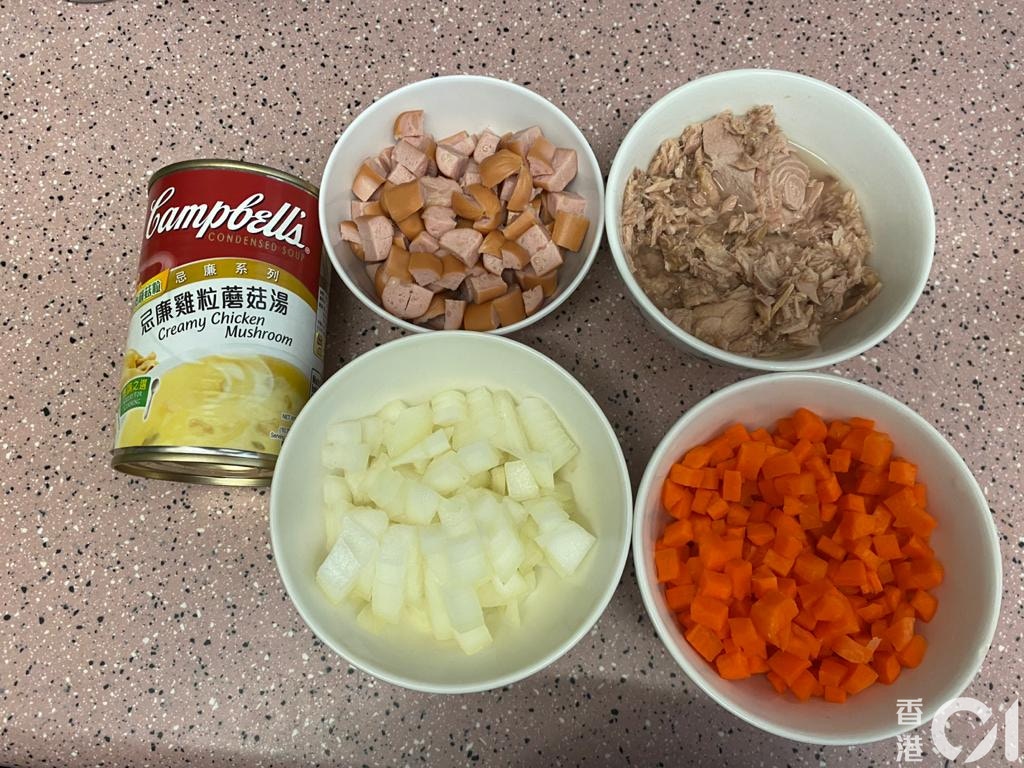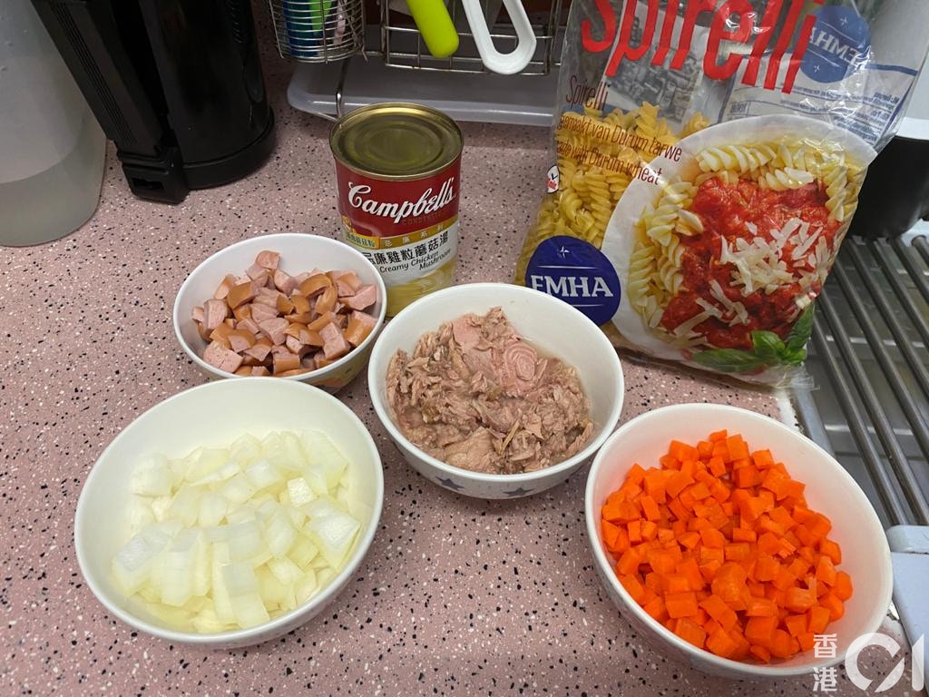 白汁吞拿魚螺絲粉所需材料:白汁忌廉雞湯、礦泉水浸吞拿魚、芝士腸、蘿蔔、洋蔥、螺絲粉。