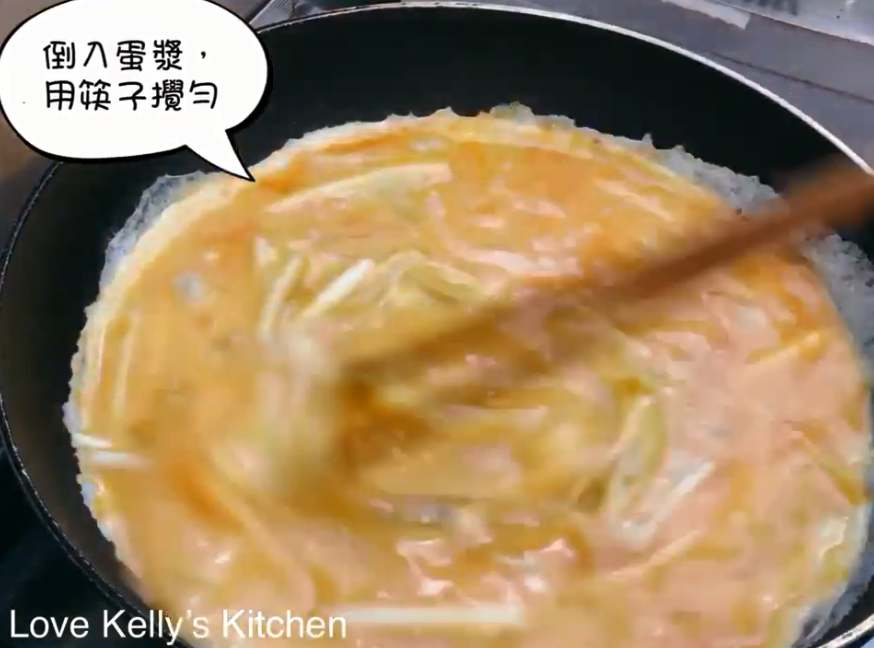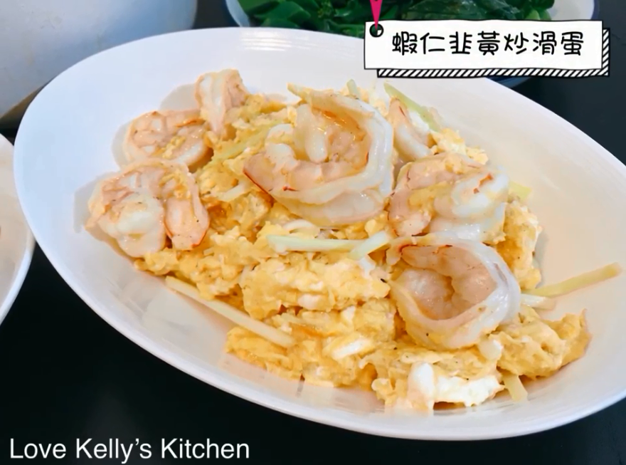 3)用回此鑊再加少許油,加入韭黃炒香,倒入蛋漿,用筷子攪勻,將蝦仁回鑊一齊炒,以免太散最後用鑊鏟兜勻便可