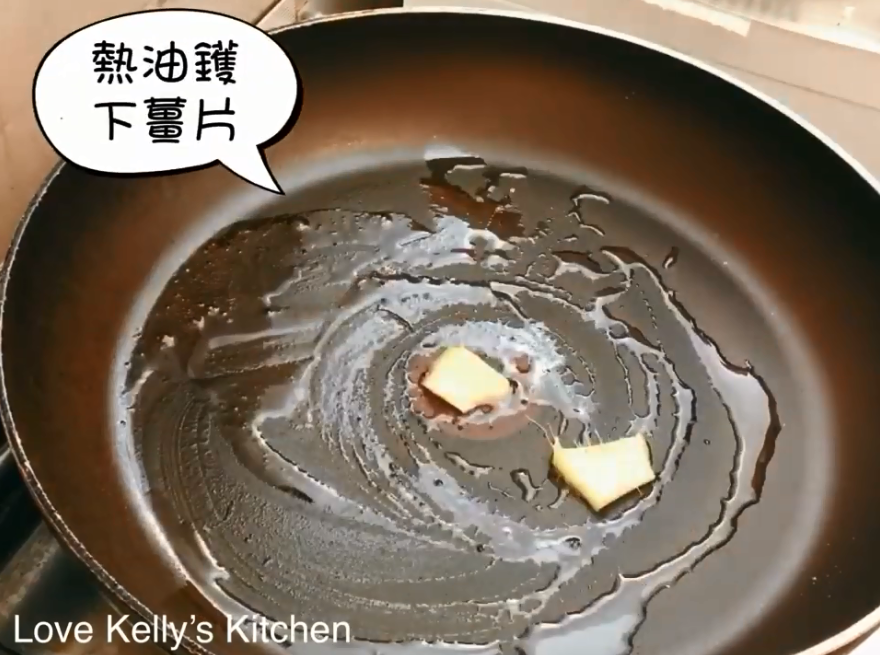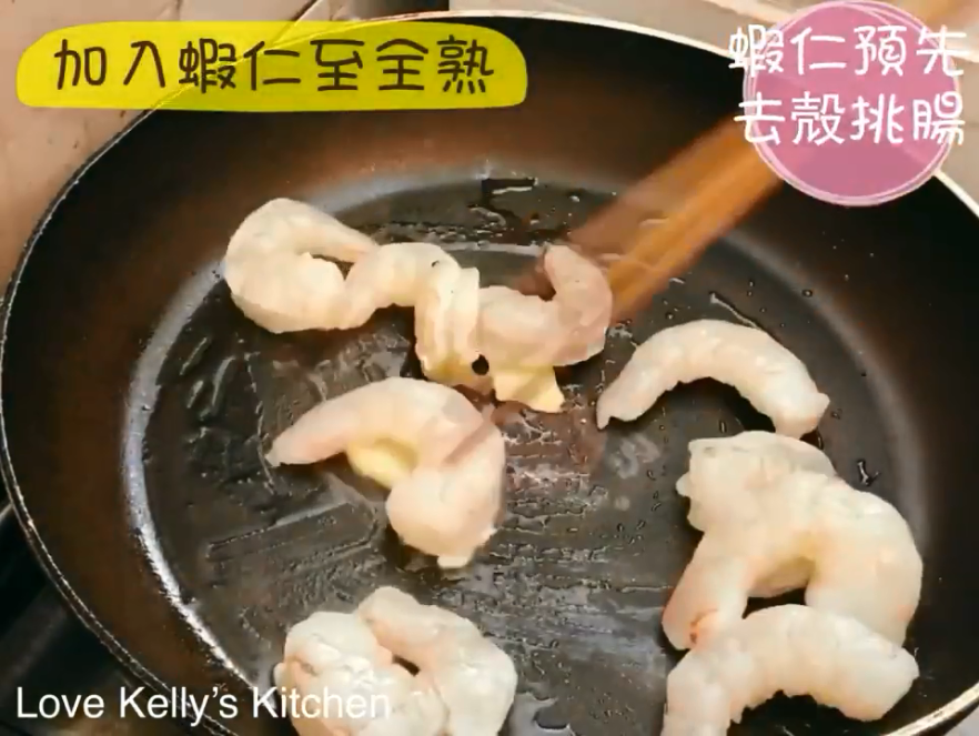 2)熱油鑊下薑片,加入蝦仁至全熟;