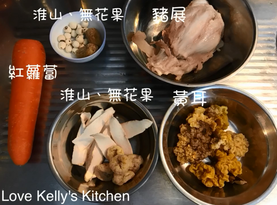 1) 黃耳早一日浸軟身,去走污糟的掟;無花果一開二,淮山浸一浸水,紅蘿蔔去皮切件備用;