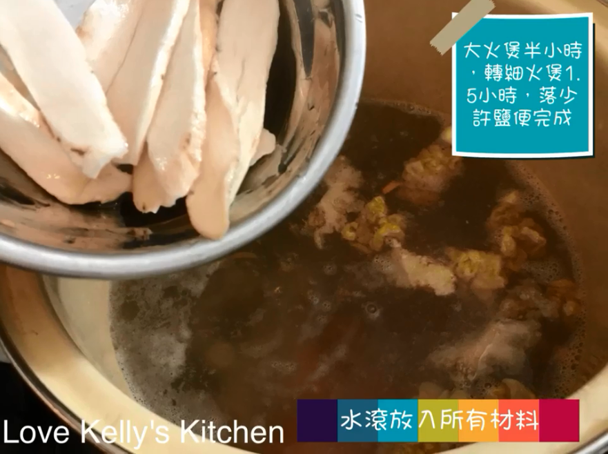 3) 水滾後放下所有材料,大火煲半小時,然後轉細火繼續煲1.5小時,最後下少許鹽便完成