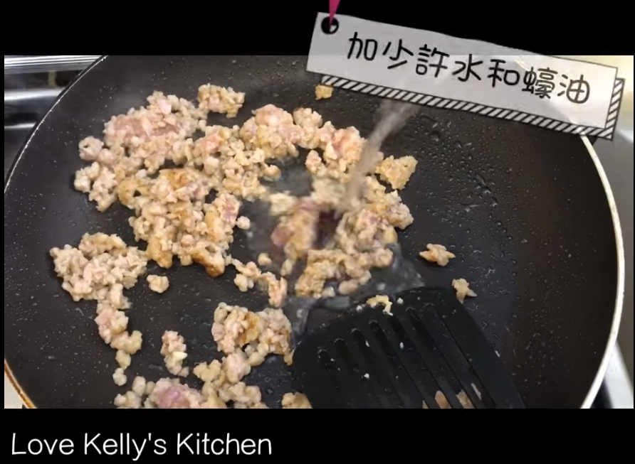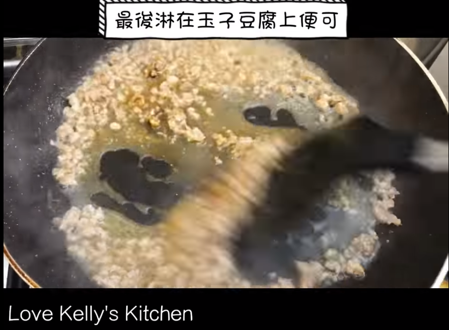 4)用回此鑊炒熟肉碎,加少許水和蠔油,最後淋在玉子豆腐上便可