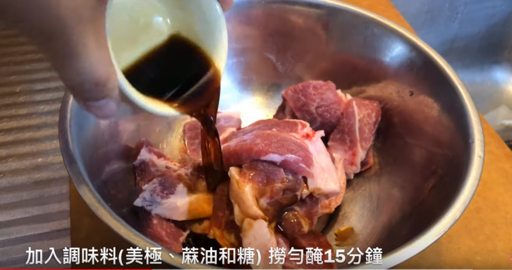 1) 肉碎加入調味料攪勻,醃15分鐘;