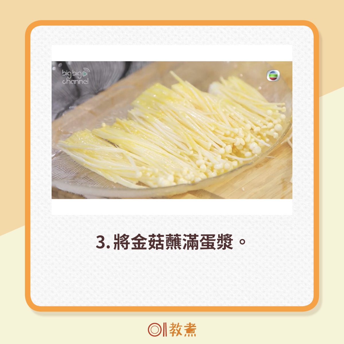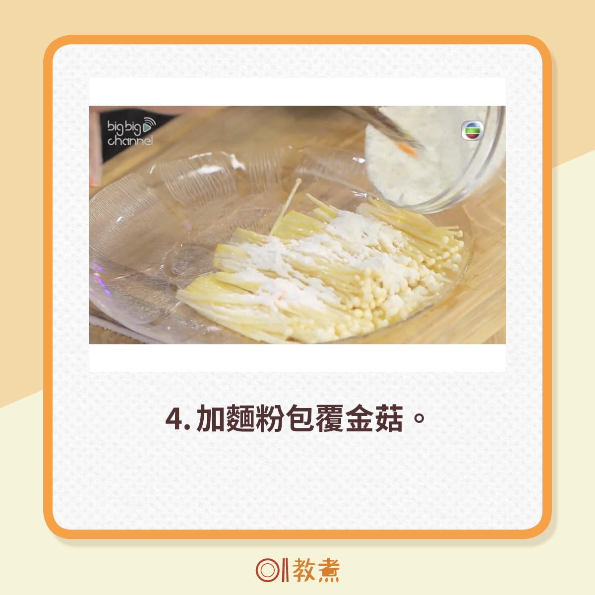 3. 金菇切去有泥部份,洗淨後切成一小排,蘸上蛋漿,平鋪在碟上,再撲上麵粉