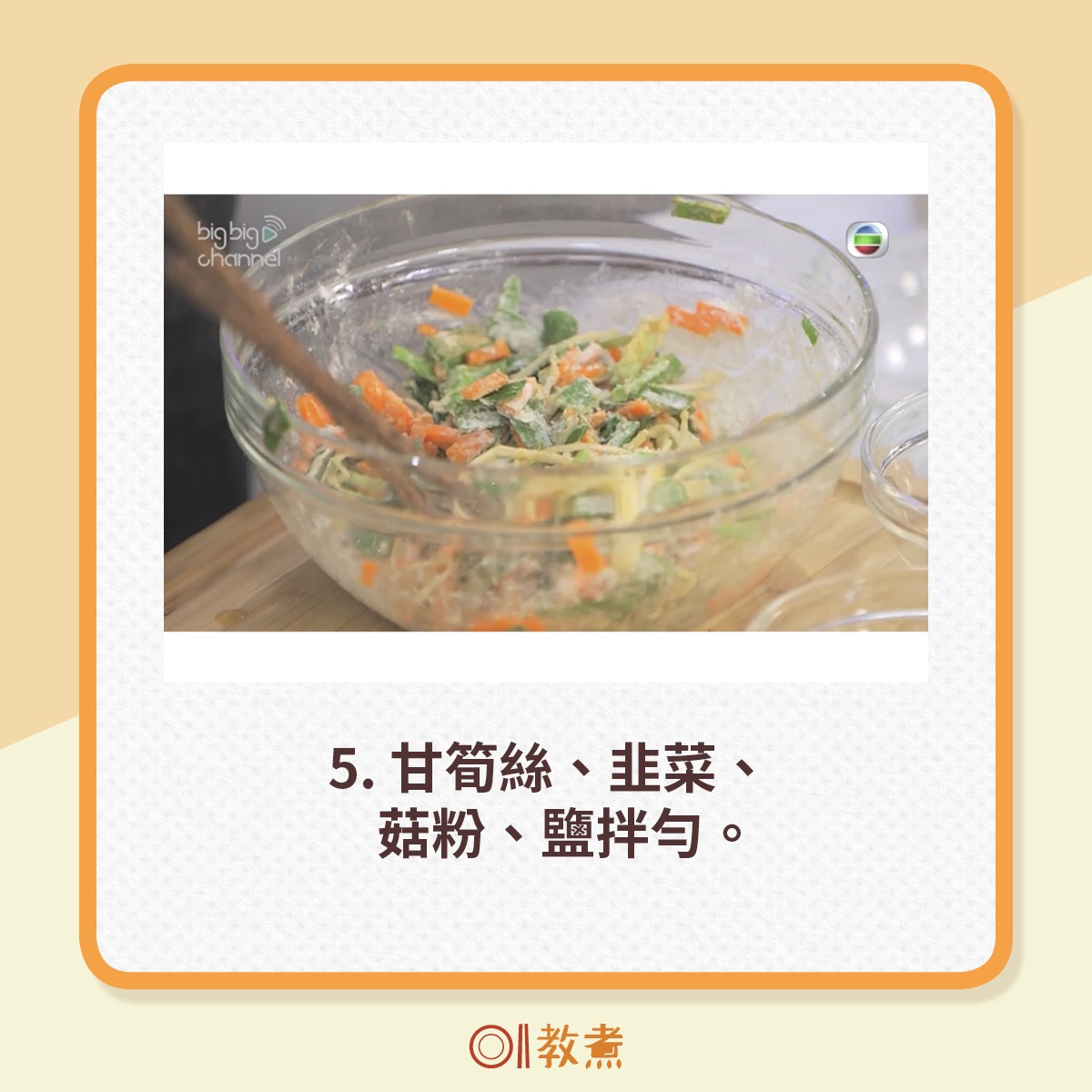 4. 甘筍、韭菜碎及麵粉拌勻(視狀況調整蛋液及麵粉量) ,加少許鹽、菇粉調味備用