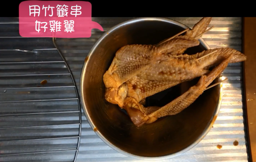 2)用竹籤串好雞翼備用;