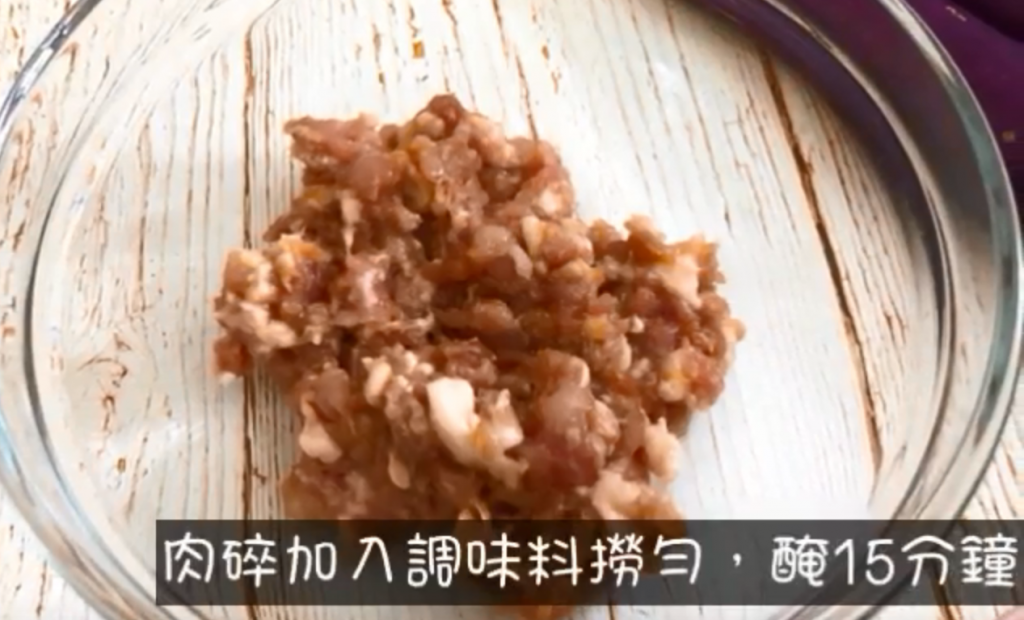 1)肉碎加入調味料撈勻,醃15分鐘,備用;