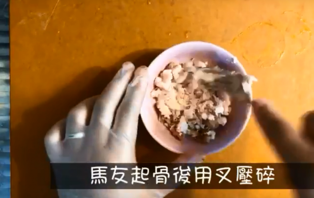2)馬友沖一沖水,抹乾後蒸8分鐘,馬友起骨後用叉壓碎,備用;