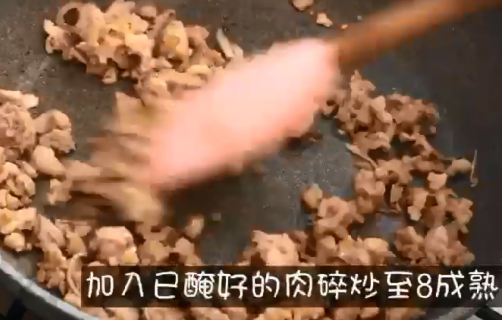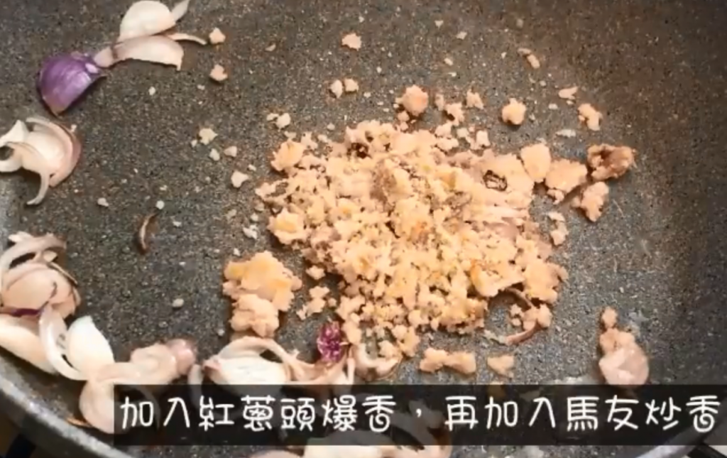 2)熱油鑊爆香紅蔥頭,加入肉碎炒香,再加調味料和水,蓋上蓋用中細火煮3分鐘;