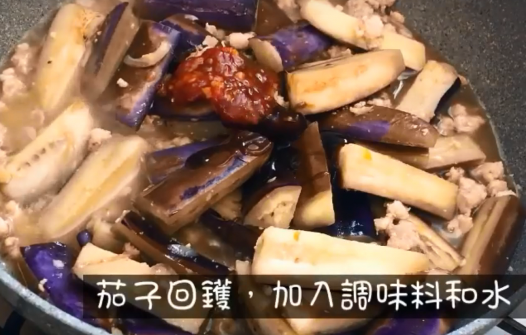 4)加入紅蔥頭爆香,再加入馬友炒香,加入已醃好的肉碎炒至8成熟,茄子回鑊,加入調味料和水,蓋上蓋用細火煮5分鐘,打芡汁便完成