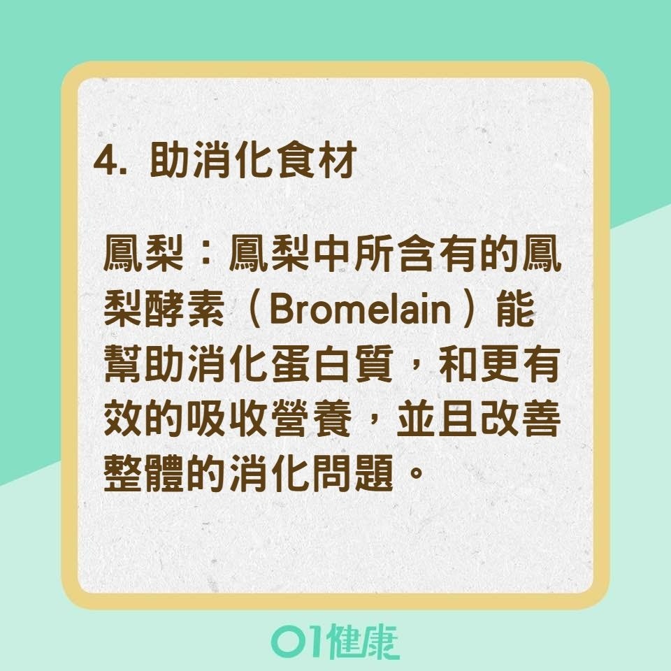 鳳梨:鳳梨中所含有的鳳梨酵素(Bromelain)能幫助消化蛋白質,和更有效的吸收營養,並且改善整體的消化問題。