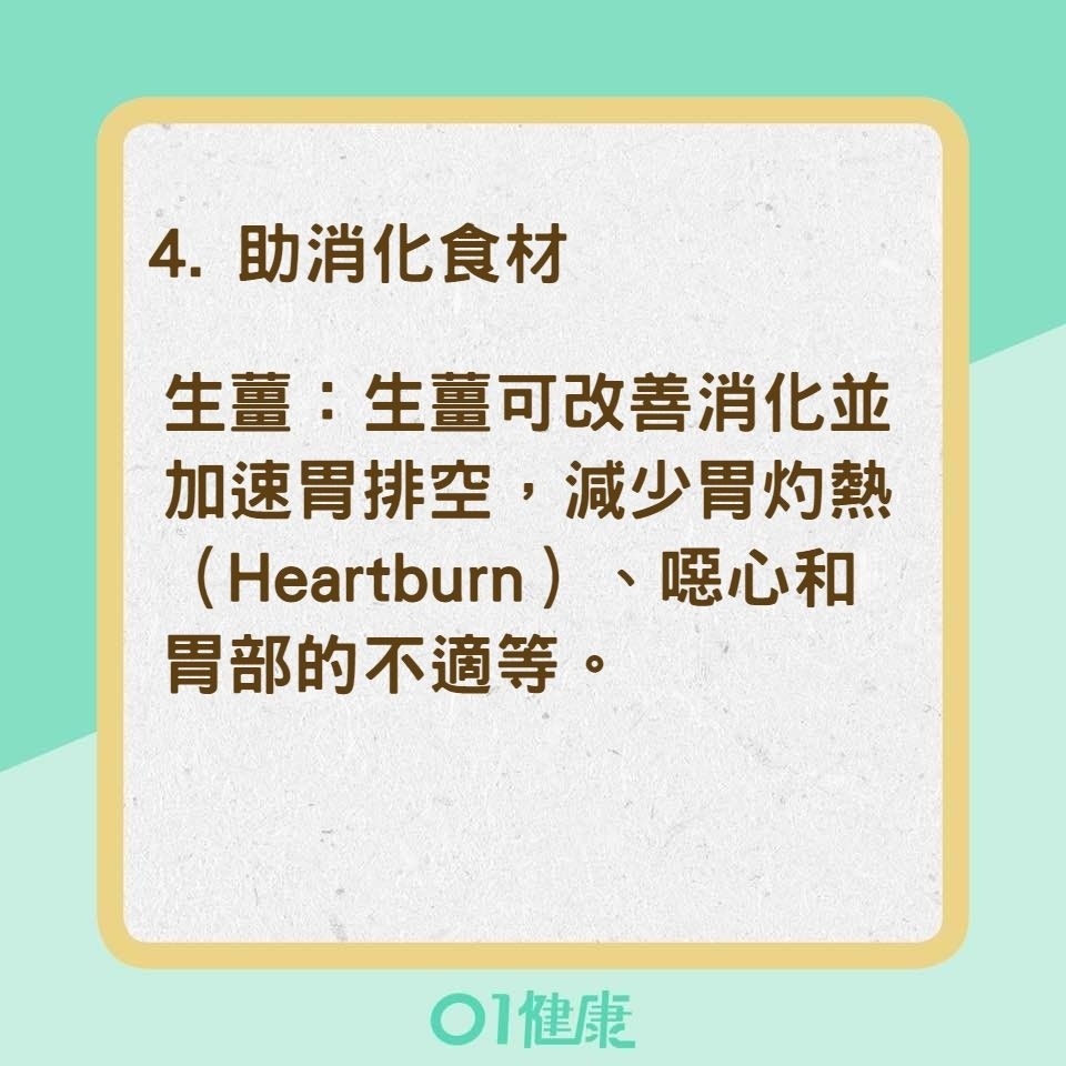 生薑:生薑可改善消化並加速胃排空,減少胃灼熱(Heartburn)、噁心和胃部的不適等。