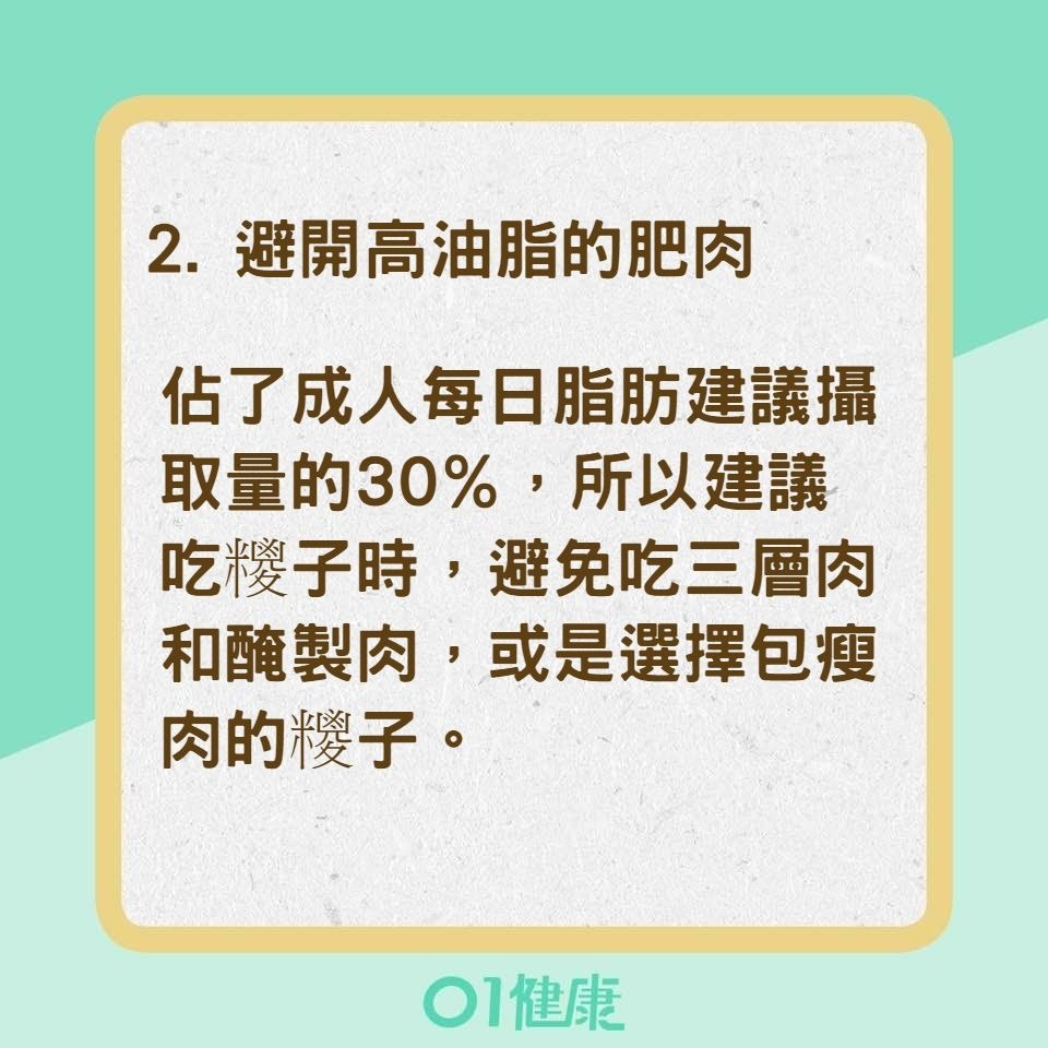 許多人都會用三層肉(又稱五花肉)當肉糭餡料,但其油脂含量高得驚人,每顆中等大小的糭子就含有17克脂肪(約3~4茶匙的油),佔了成人每日脂肪建議攝取量的30%,所以建議吃糭子時,避免吃三層肉和醃製肉,或是選擇包瘦肉的糭子。