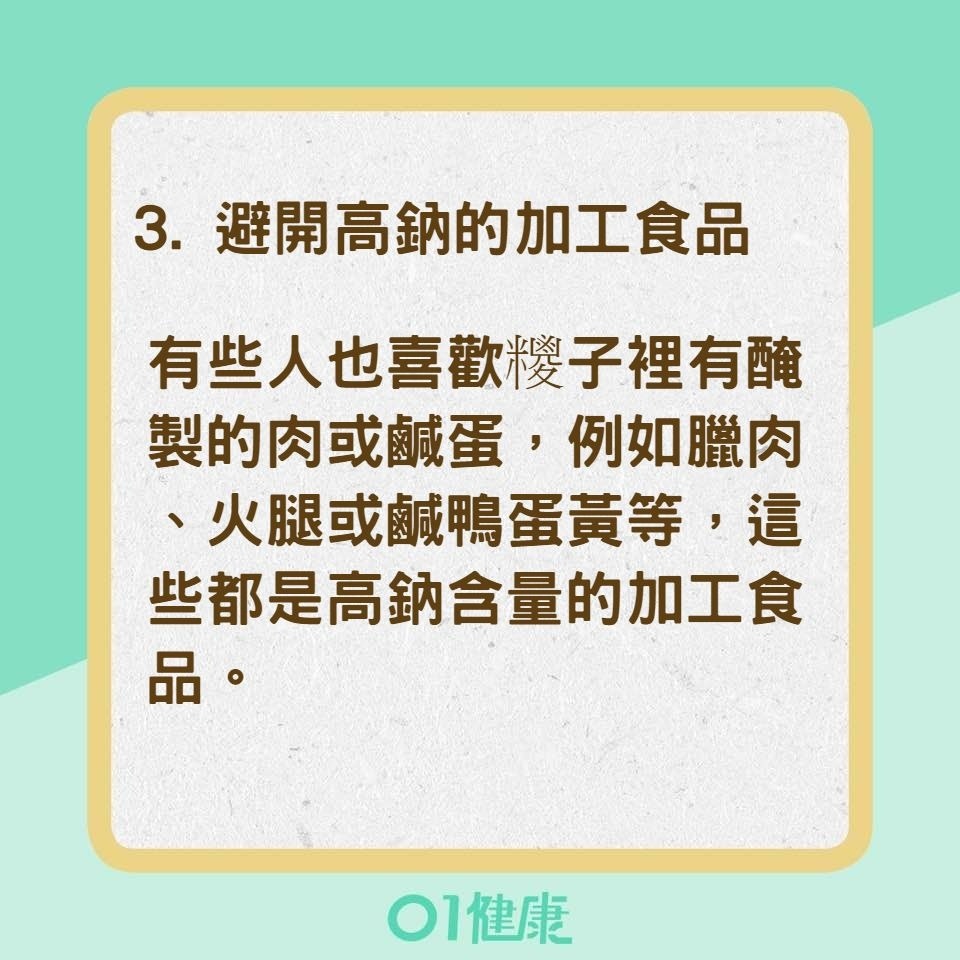 有些人也喜歡糭子裡有醃製的肉或鹹蛋,例如臘肉、火腿或鹹鴨蛋黃等,這些都是高鈉含量的加工食品,最好少吃以減少罹患高血壓(Hypertension)的機率,若本身已有高血壓,更該避免這類食材。