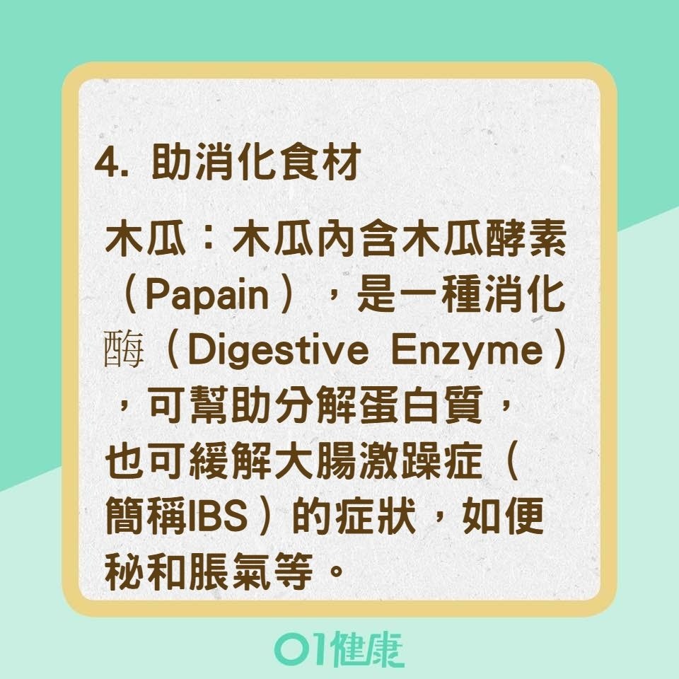 木瓜:木瓜內含木瓜酵素(Papain),是一種消化酶(Digestive Enzyme),可幫助分解蛋白質,也可緩解大腸激躁症(簡稱IBS)的症狀,如便秘和脹氣等。