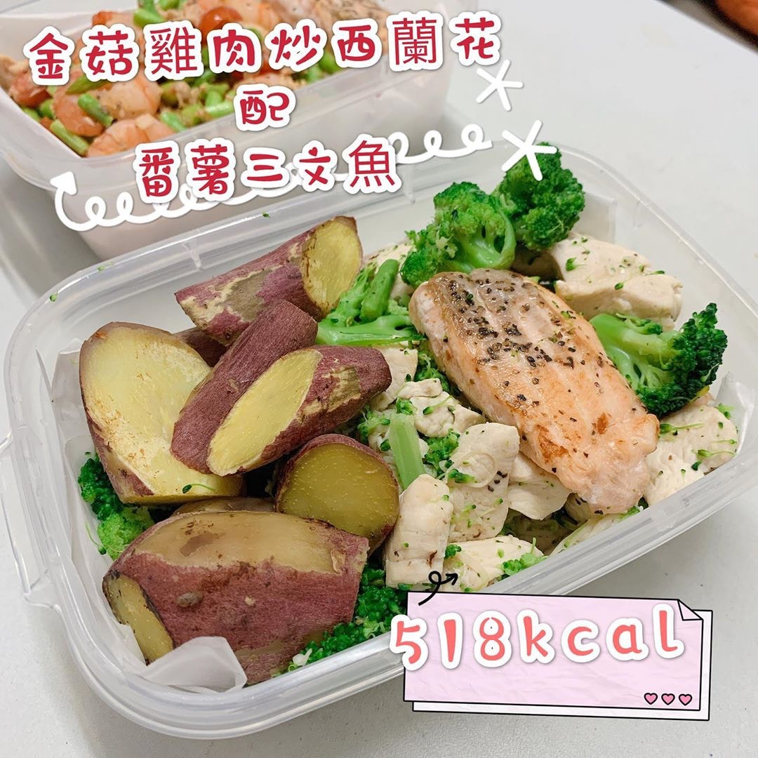 金菇雞肉炒西蘭花配番薯三文魚(518kcal)(willa.wwl@instagram)