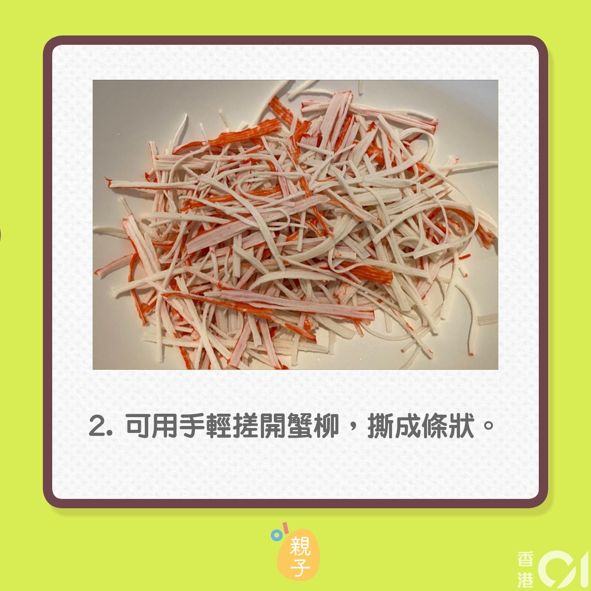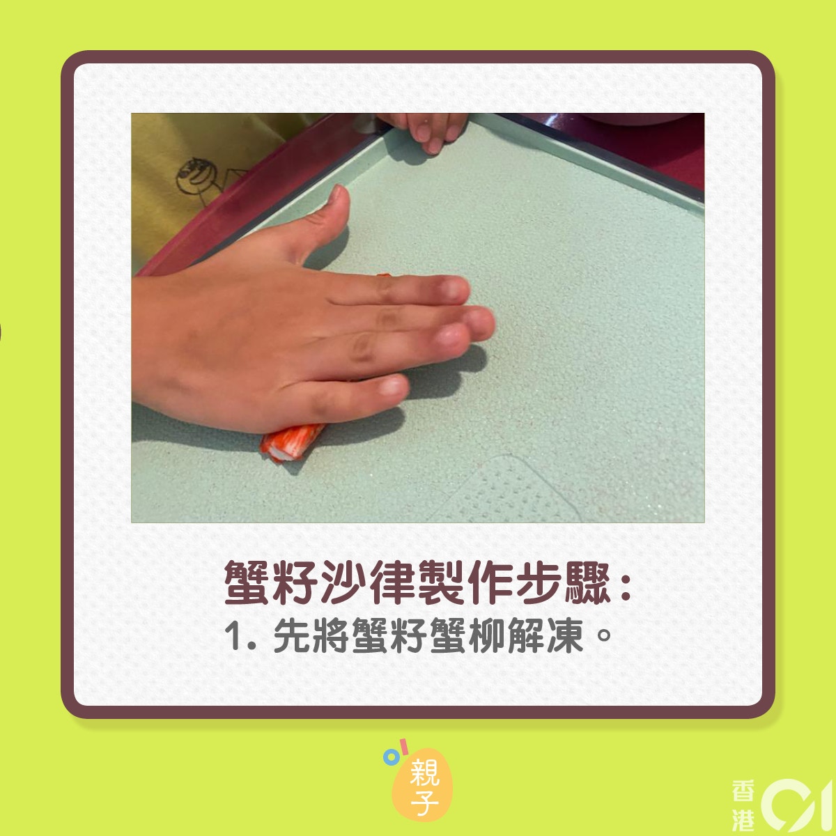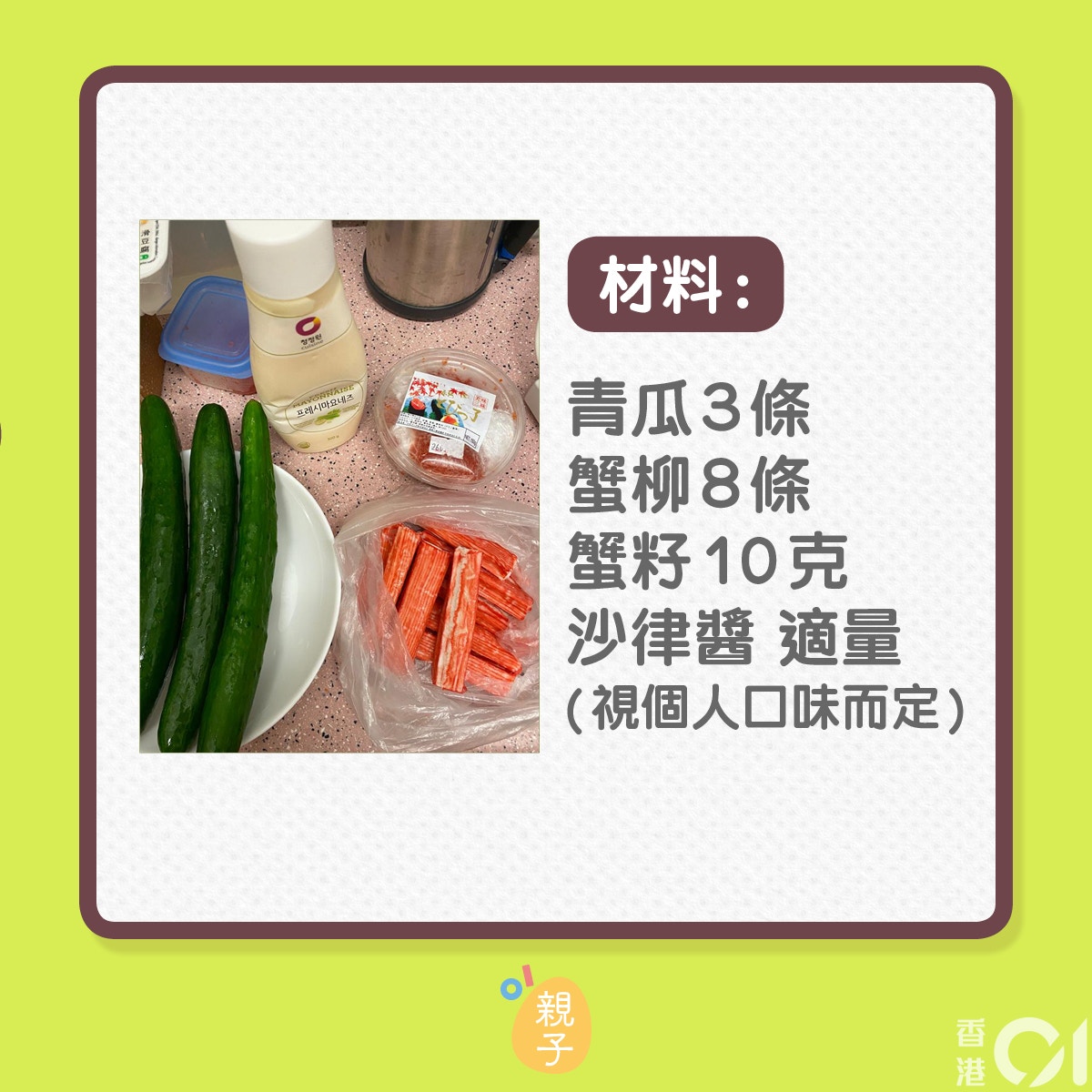 關鍵是蟹籽,現在很多日式超市可以買得到,這也是非常適合親子一齊製作的料理,讓小朋友有機會拿著刀子切菜,每一個步驟小朋友都可以做得到,成品亦好味,令小朋友容易獲得滿足感,培養下廚興趣。