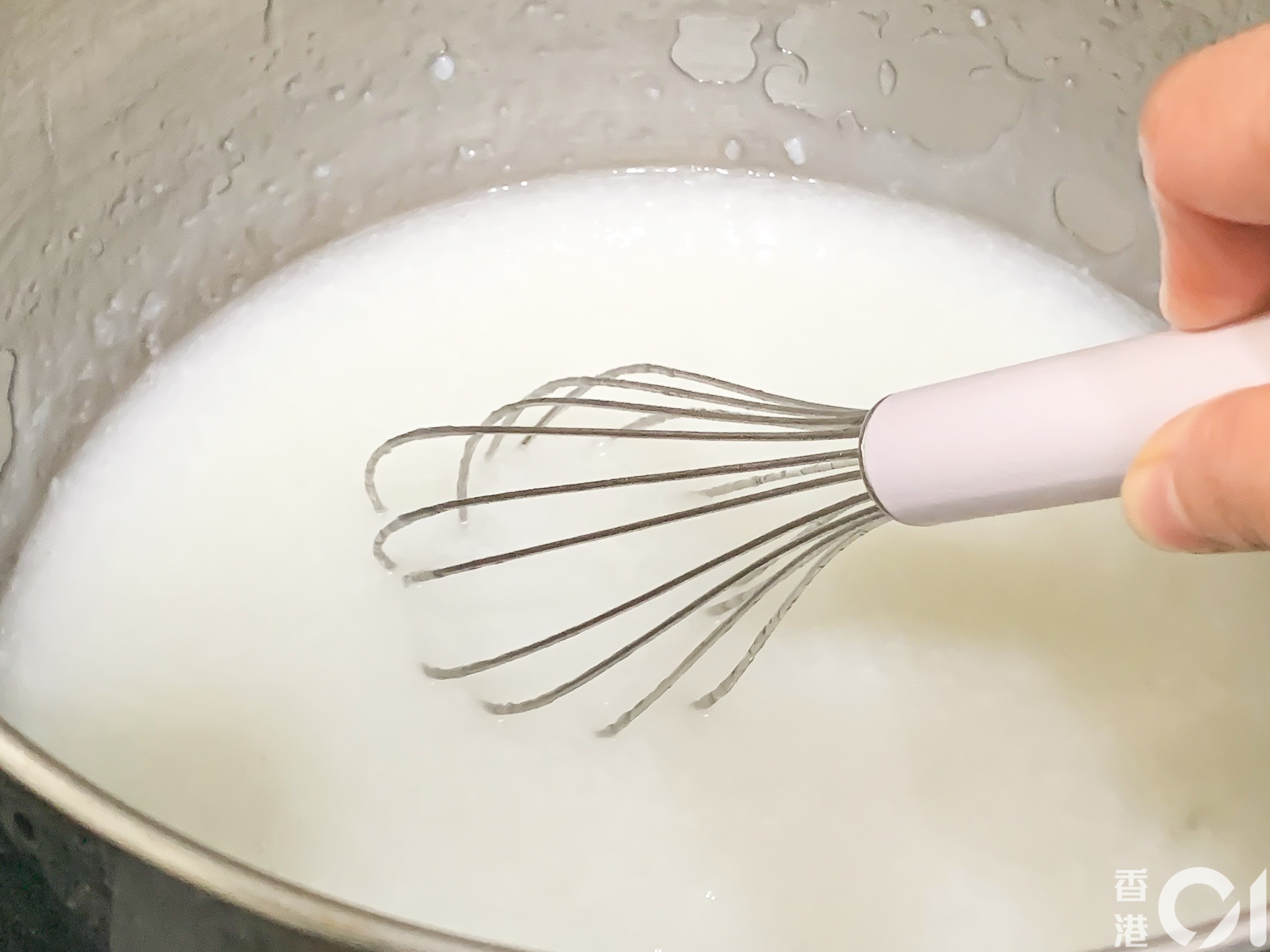 再打開蓋,用拂蛋器給少少力攪拌1分鐘,目的為了「出稠」及「開花」。(尹嘉蔚攝)