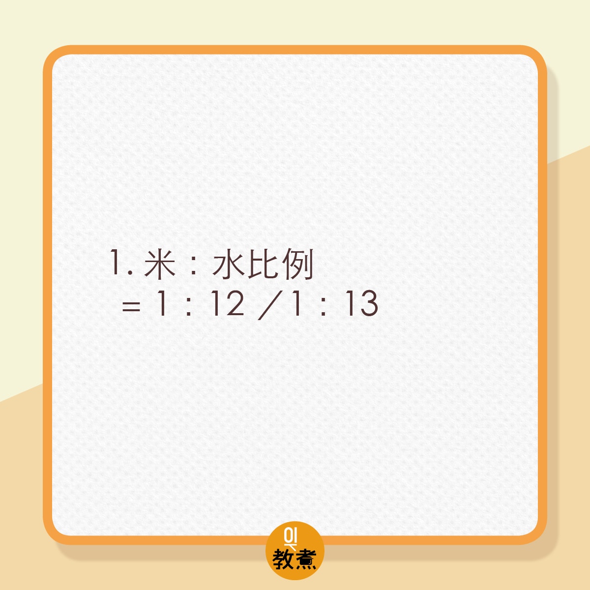 總結︰洗米> 米:水=1:12> 浸米半小時> 大滾水落米> 水再滾轉細火蓋住(留虛位)煲10分鐘> 加少少油>蓋住(留虛位)細火煮5分鐘> 打開蓋用拂蛋器攪1分鐘>蓋住(留虛位)用細火再煮5分鐘完成。(尹嘉蔚攝)