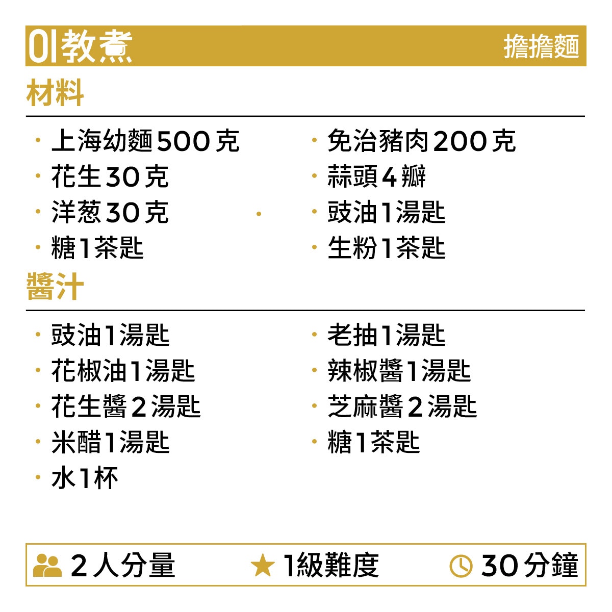 擔擔麵︰十大名麵麻辣鮮香,30分鐘煮出四川風味。