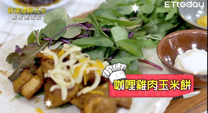 本身也有經營咖哩店副業的詹子晴,邊炒肉邊喃喃自語說:「(料理)有咖哩,小朋友都超愛的。」GIGI恍然大悟道:「欸妳開咖哩店!所以妳說咖哩炒醬好吃,絕對超好吃。」老闆娘拍胸脯保證,隨即把炒熟的雞肉放到已經鋪好生菜與芝士的餅皮上,帶有異國風情的咖哩料理,又輕鬆完成了一道!