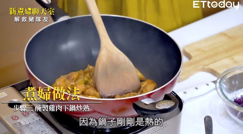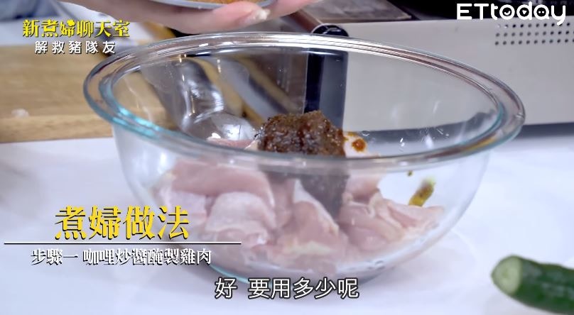 這次她的絕招就是把咖哩炒醬直接當做雞肉醃料(Youtube@播吧 影片截圖)