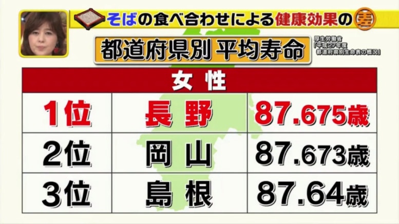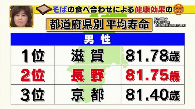 以著名生產蕎麥麵的長野縣為例,該地方的男性平均壽命排第二。(日本電視台TBS節目《この差って何ですか?》電視截圖)