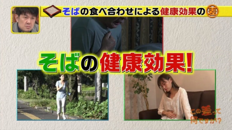 池田教授就預防高血壓、提高免疫力及改善便秘這三方面講解配搭什麼食材令蕎麥麵的營養倍增。(日本電視台TBS節目《この差って何ですか?》電視截圖)