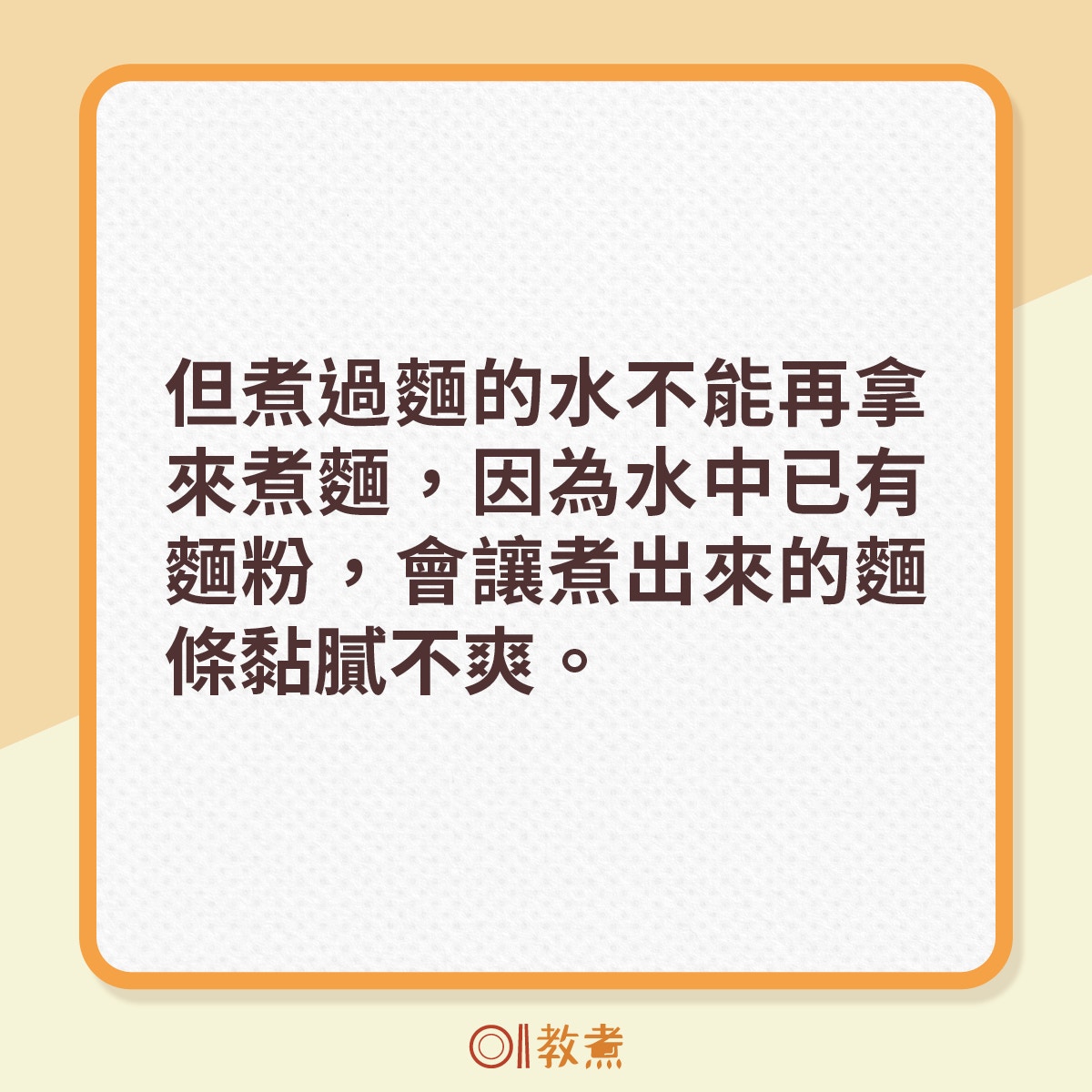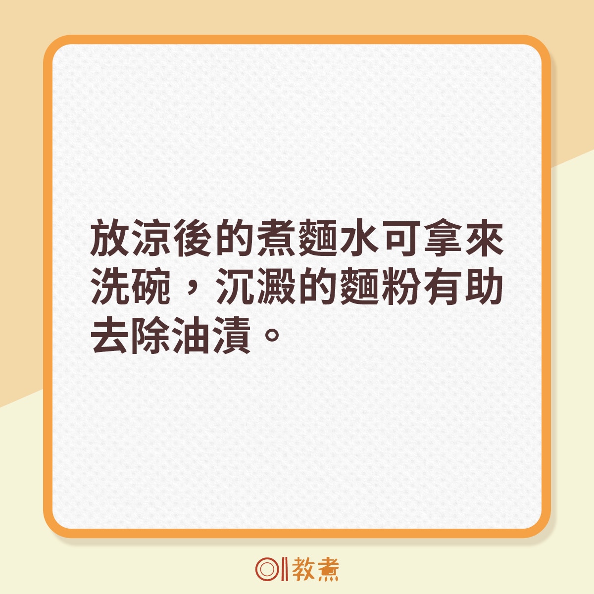 放涼後的煮麵水可拿來洗碗,沉澱的麵粉有助去除油漬。但煮過麵的水不能再拿來煮麵,因為水中已有麵粉,會讓煮出來的麵條黏膩不爽。