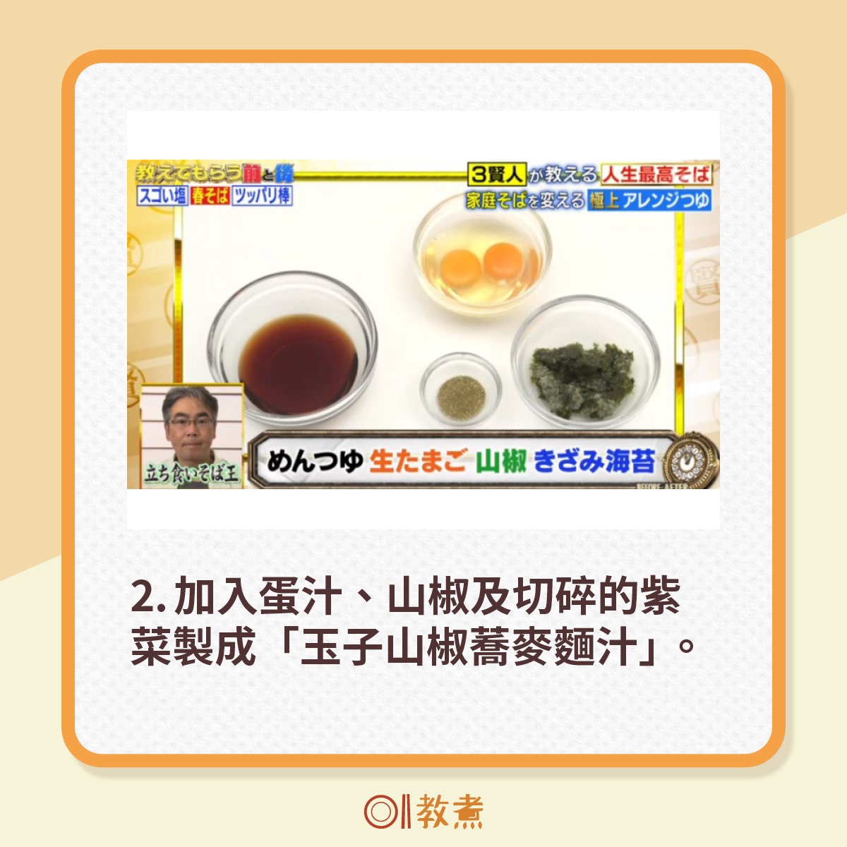節目組邀請了神戶學院大學營養學系名譽教授池田清和教授觀眾如何吃蕎麥麵令其營養倍增。(日本電視台TBS節目《この差って何ですか?》電視截圖)