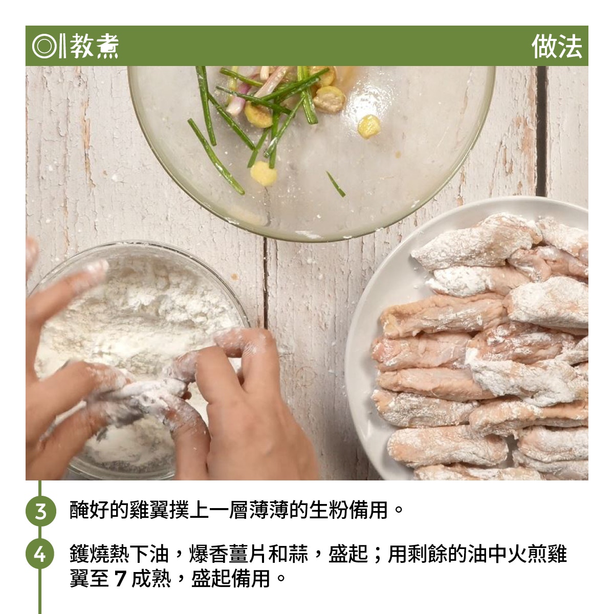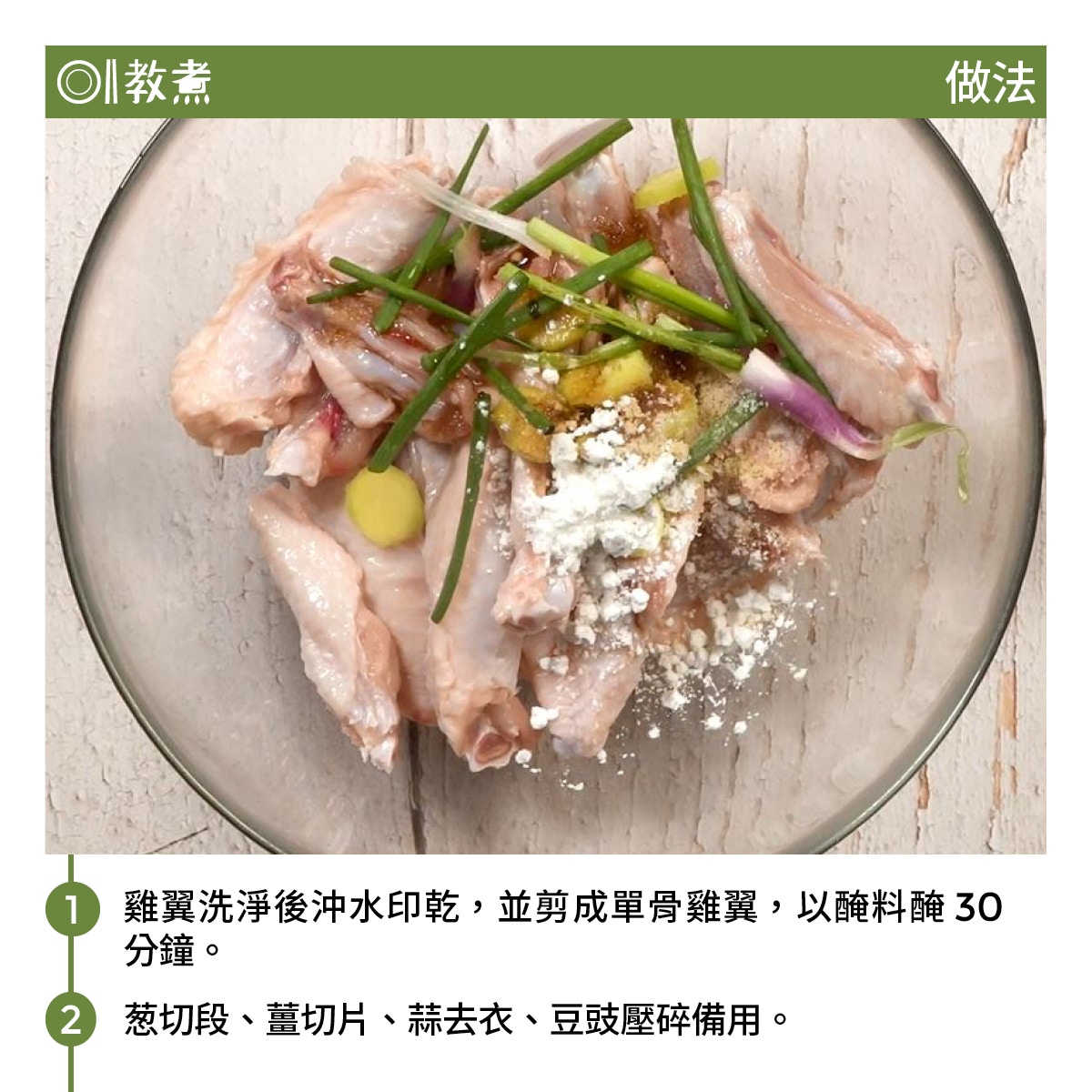 (1)醃雞翼時加入薑、葱,而葱白是香氣最重的部分,必須保留。