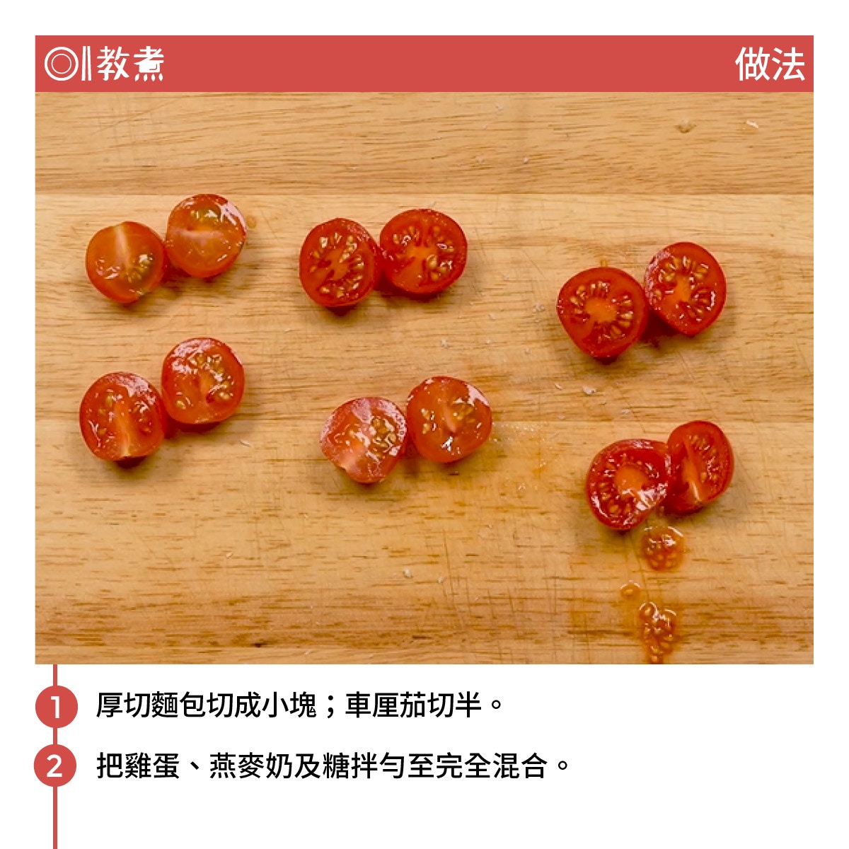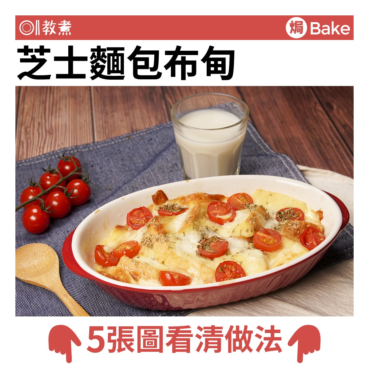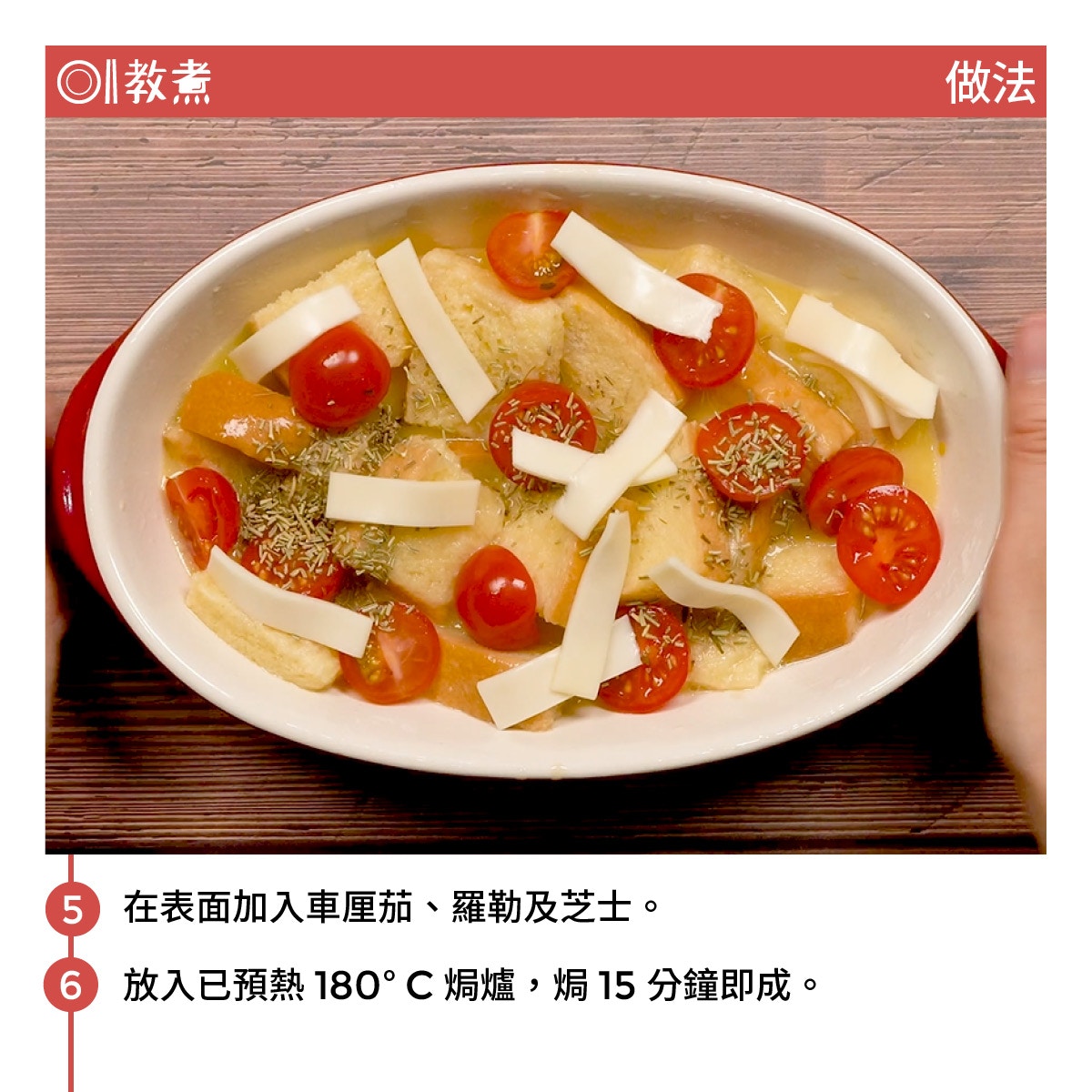 麵包布甸常常作為解決隔夜麵包的方法之一,因為不用浪費食物之餘,亦能變成受歡迎的菜式。由於時常接觸到的麵包布甸都是甜食,所以今次決定一反傳統將它改成鹹食,以Pizza的概念為基礎,用上芝士、車厘茄及羅勒製成芝士麵包布甸。整個感覺就像是適合周日的brunch或下午茶小吃,而且製作簡單快捷沒什麼技巧可言,當然亦可放上火腿等其他食材。至於選用麵包,基本上用什麼都可以,喜好軟綿口感可選擇方包,偏好煙韌脆身口感的用法國麵包便最適合。若然不想購買法包,隔夜麵包亦有異曲同工之妙。
