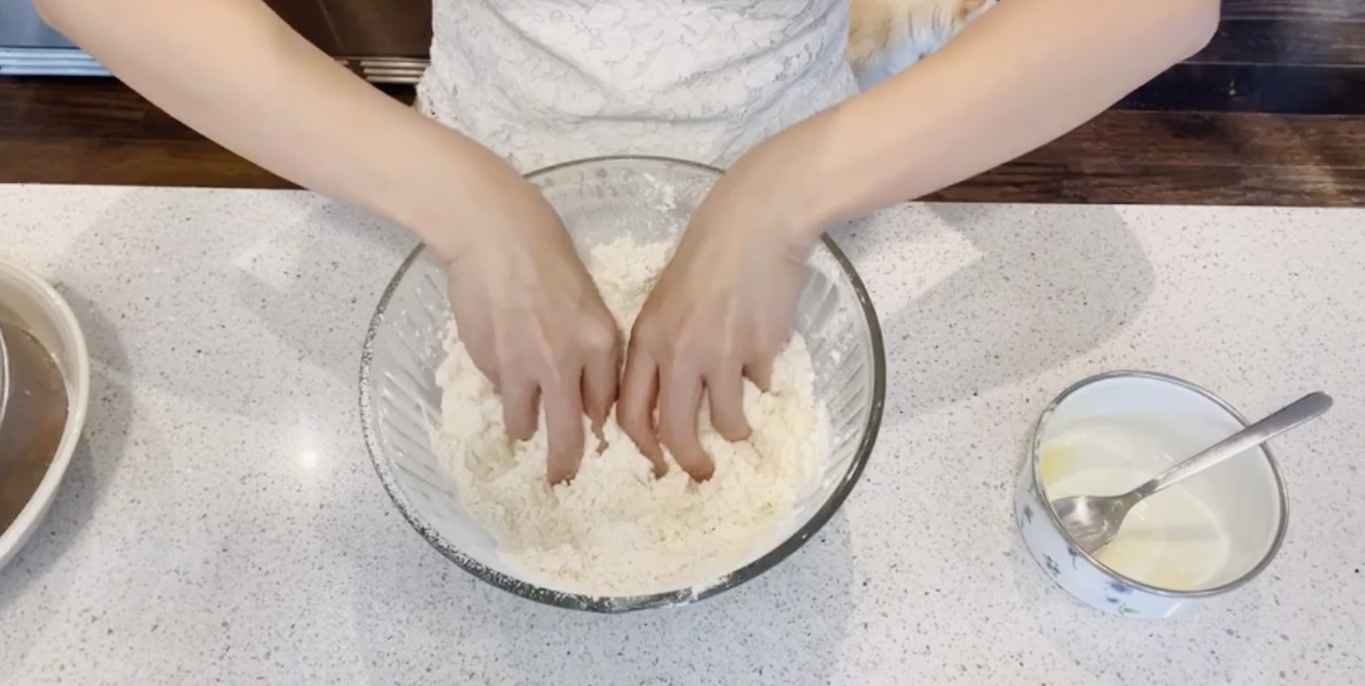 1. 我們先將240克低筋麵粉和60克植物牛油混合。用乾淨的手揉至植物牛油和麵粉混合均勻。