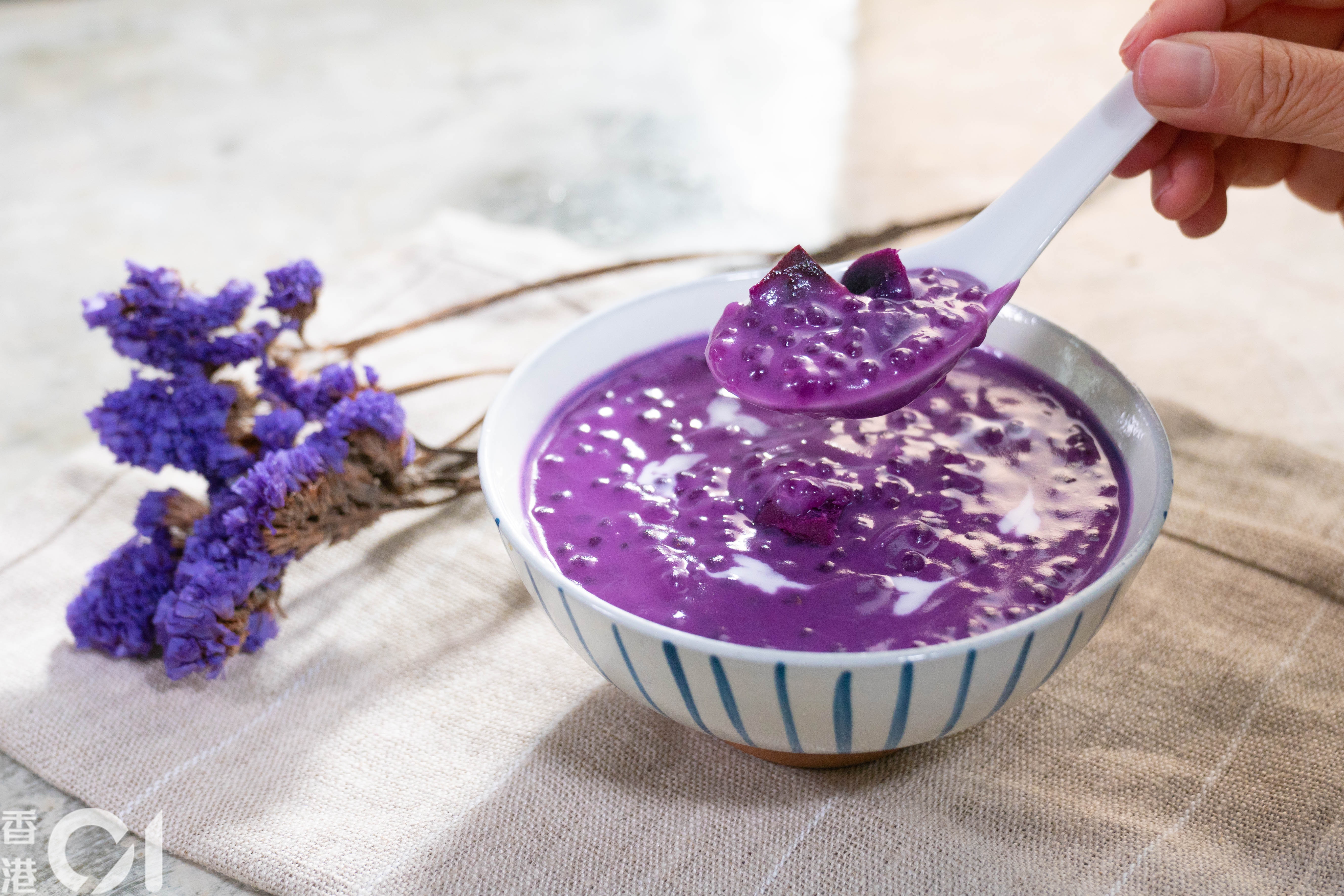 紫薯西米露︰足料中式糖水暖笠笠,超多紫花青素抗氧力高。