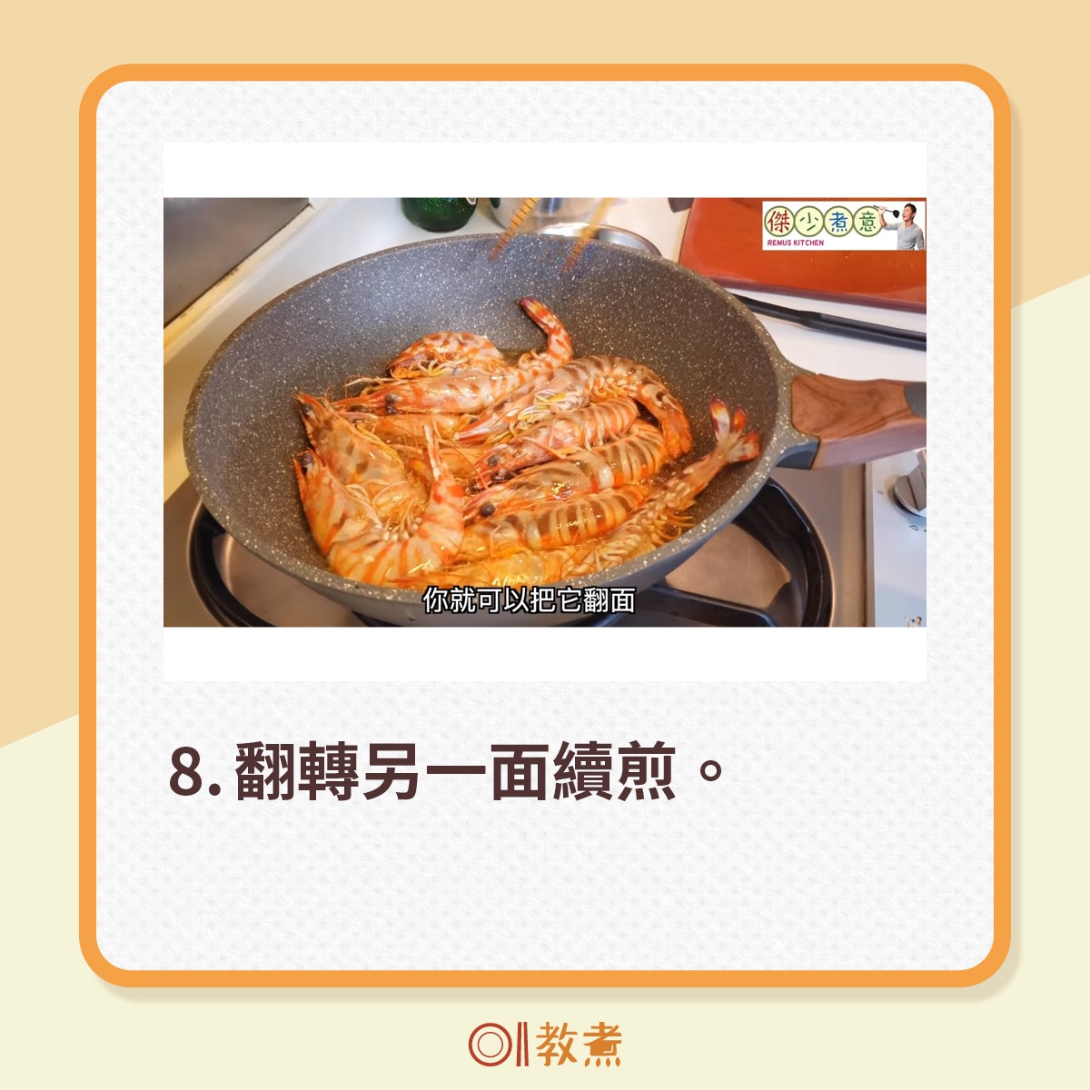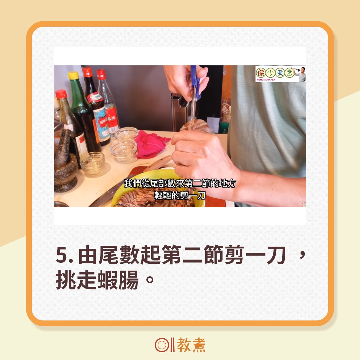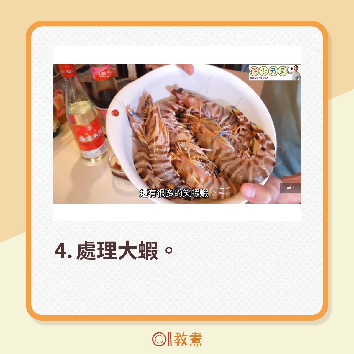 從街市買到的新鮮大蝦,挑走蝦腸,剪走蝦槍,便可起油鑊煎蝦。(傑少煮意影片截圖