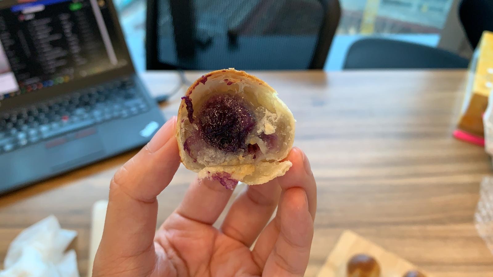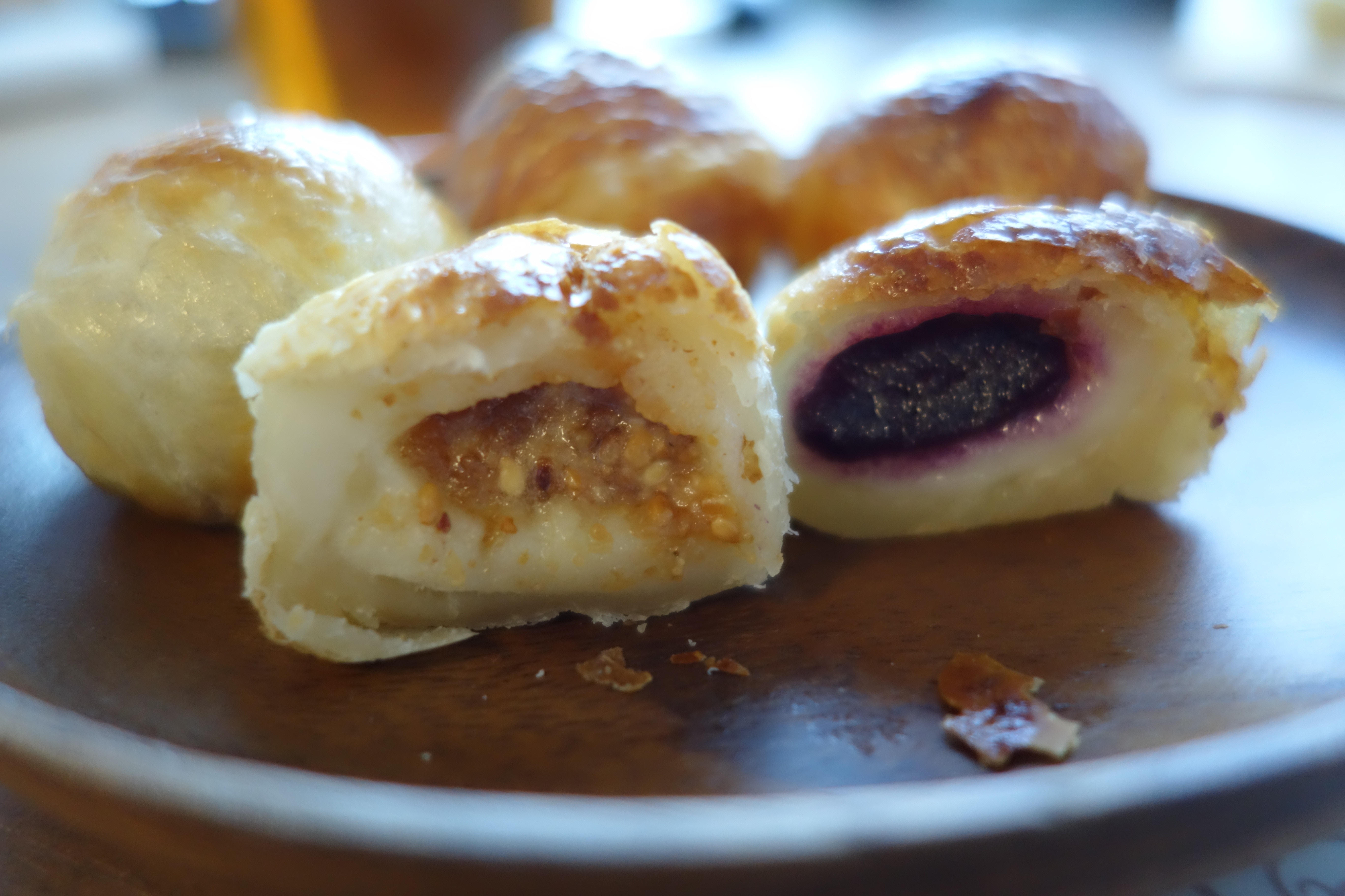 把酥皮湯圓切開可以見到流心餡料,層次分明。