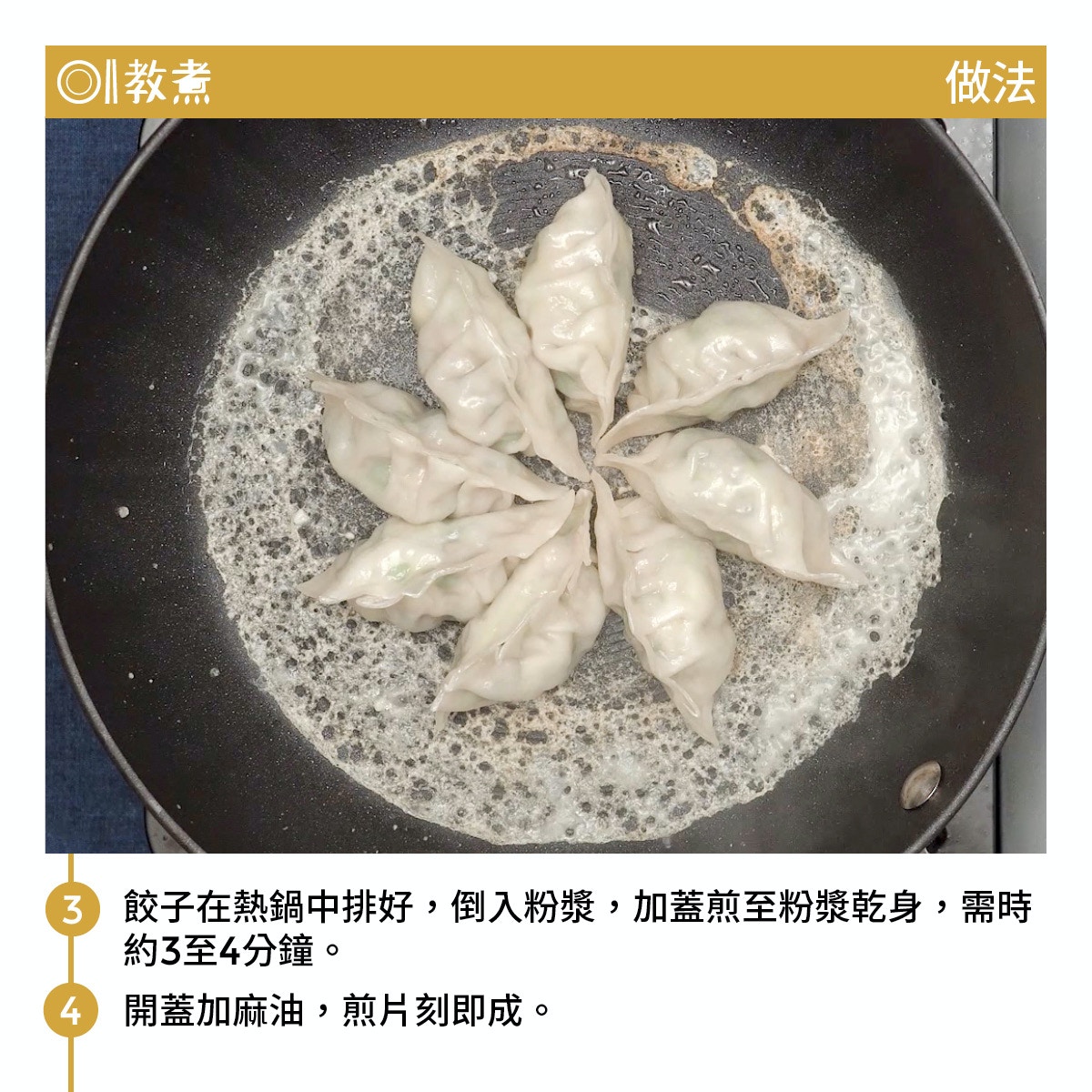 揭蓋後,再等餃子煎至收水,並加麻油,煎到餃子轉金黃色就會很脆口。(《生活小貼士》節目截圖)